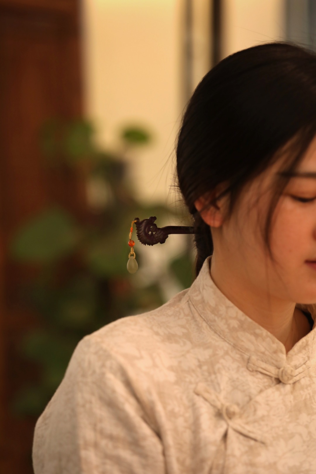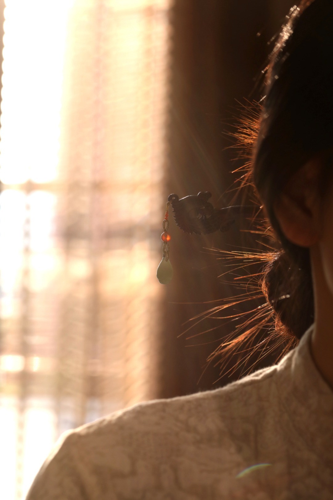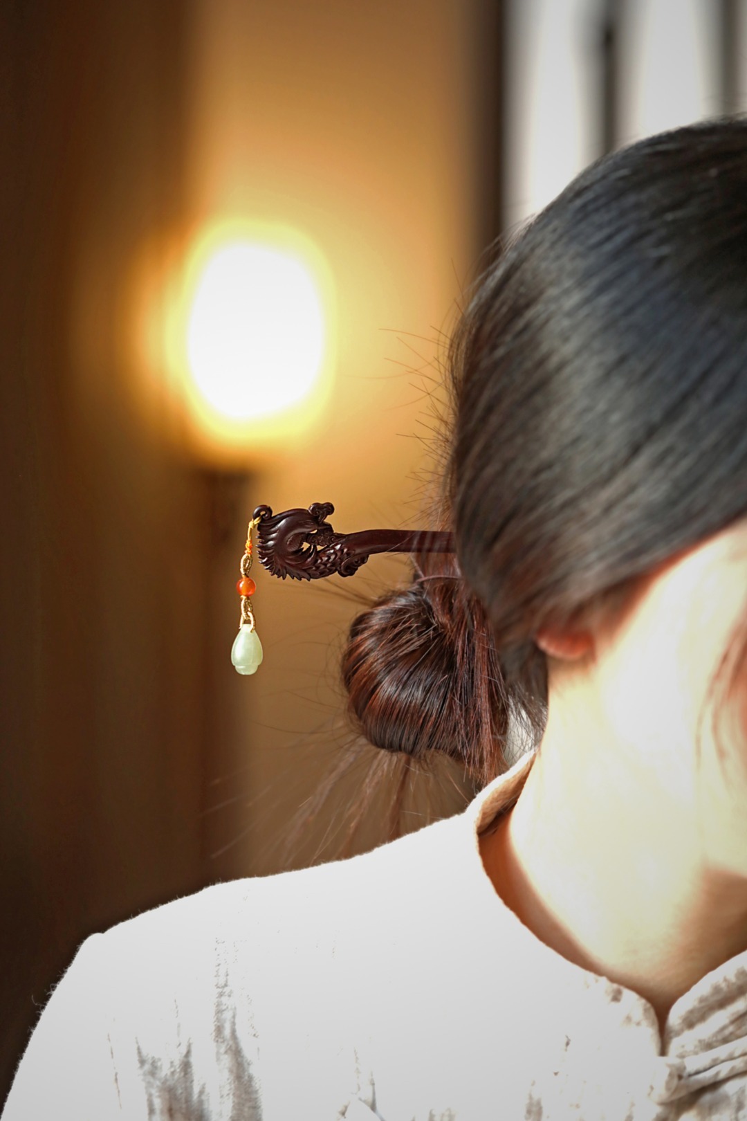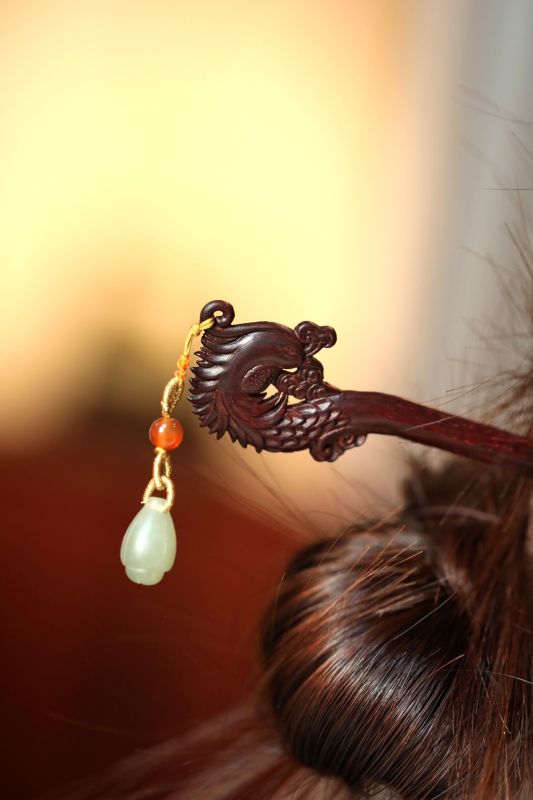 鳯凰,古代雌性瑞兽之骁楚,此发簪以紫檀镂空双面雕刻凤纹;纹理天然,纤细柔润。