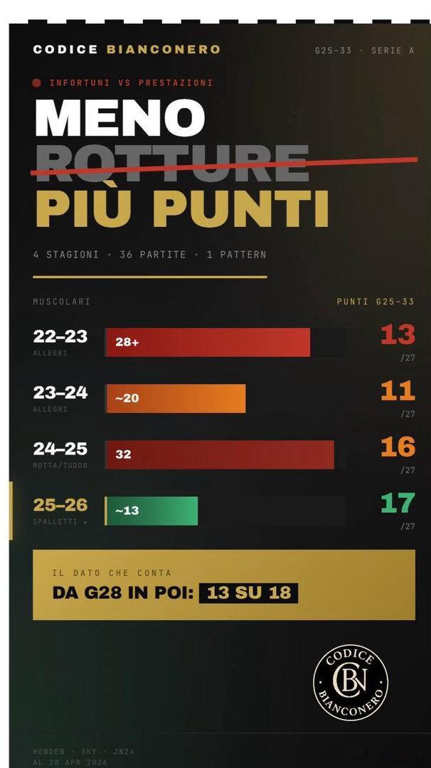 截至4月20日,尤文图斯这个春天只有13起肌肉伤病,甚至还创造过3月31日医务室首次在赛季中空无一人的神迹。极少的伤病也让尤文图斯从第28轮开始,18分中抢下了13分,无败绩。