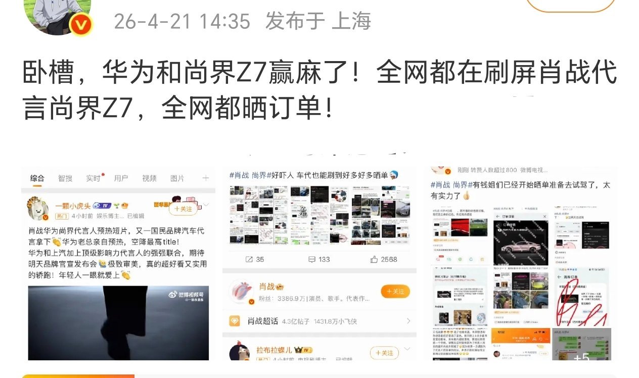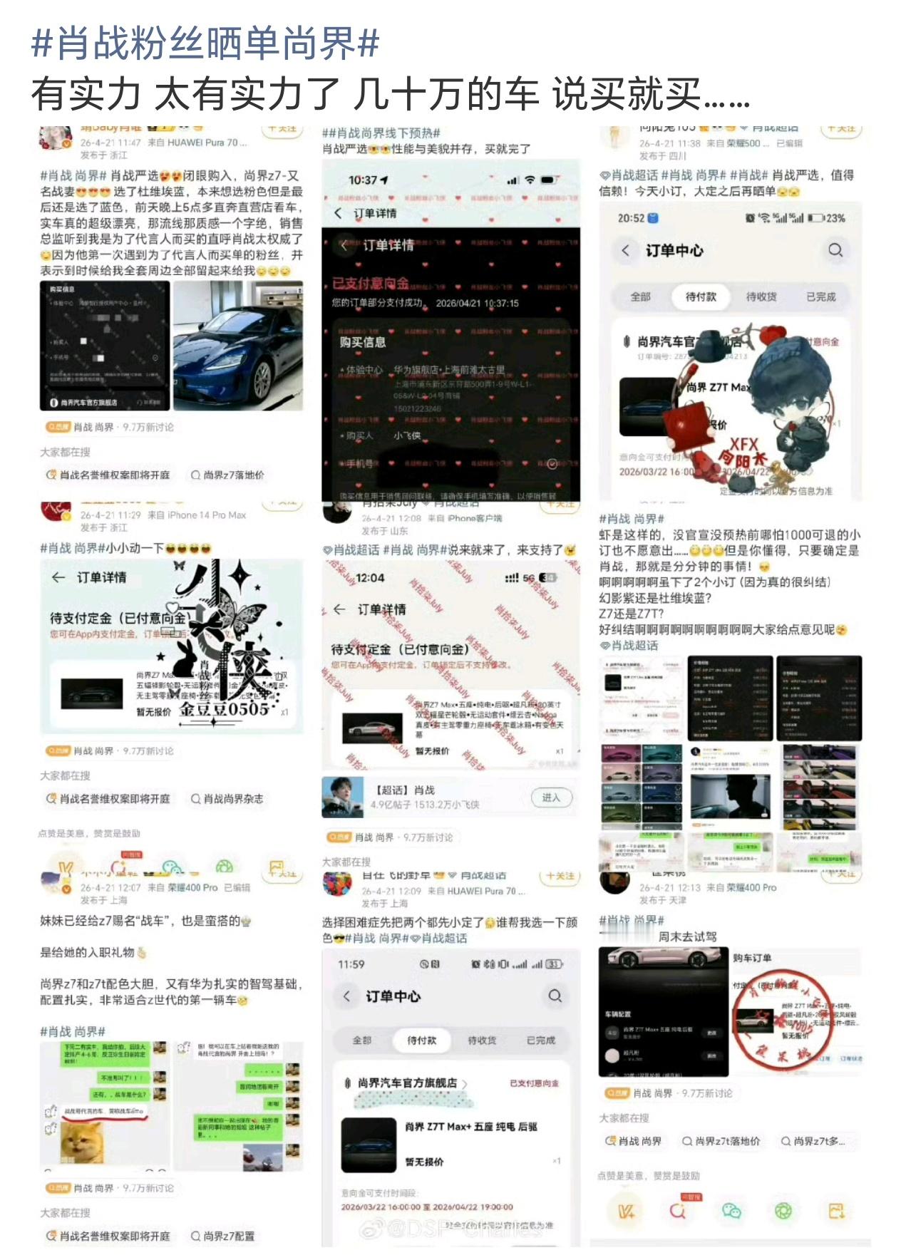 肖战粉丝晒单尚界肖战代言尚界尚未官宣,仅预热首日的声量和订单量已全网轰动,强势破圈。