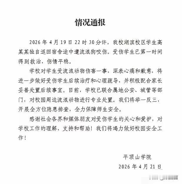 4月21日晚,学校发布通报:受伤学生伤情平稳,会做好后续治疗和心理疏导,已联合公安、城管对校园周边流浪动物专业处置,全面排查安全隐患 。