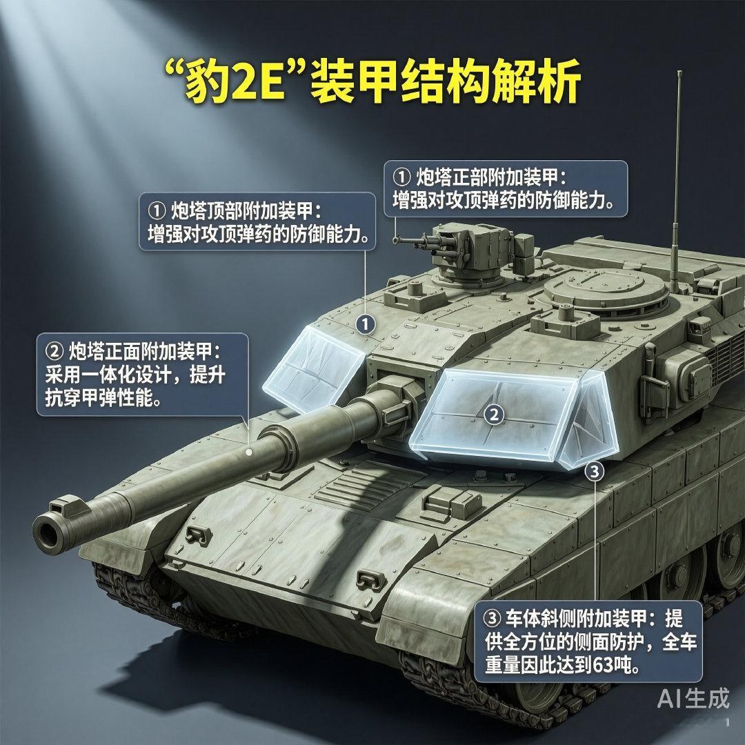 “豹2E”坦克在车体斜侧、炮塔正面和炮塔顶部增设了大量装甲,使其全车重达63吨。该车在生产过程中就将装甲加以装配,而非德国“豹2A5”坦克和“豹2A6”坦克生产后再附加。因此,“豹2E”坦克是现役的“豹2”系列坦克中防护力最好的一种。“豹2E”坦克装备了莱茵金属公司的120毫米L55坦克炮,还能换装140毫米主炮。辅助武器为2挺7.62毫米MG3通用机枪。该坦克的动力装置为MTU MB 873 Ka-501柴油发动机,最大速度可达72千米/小时。