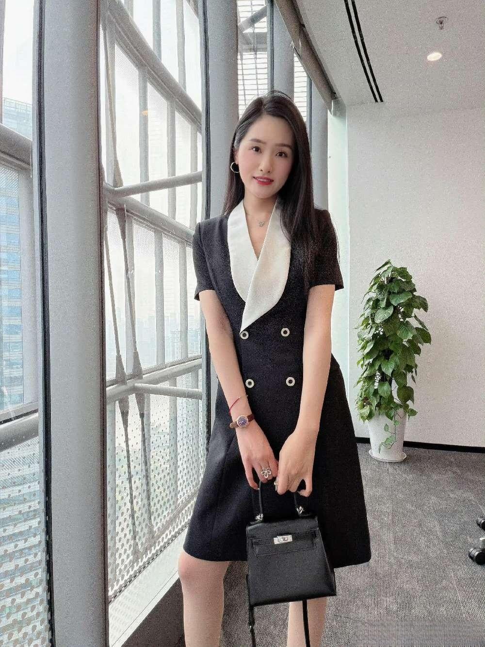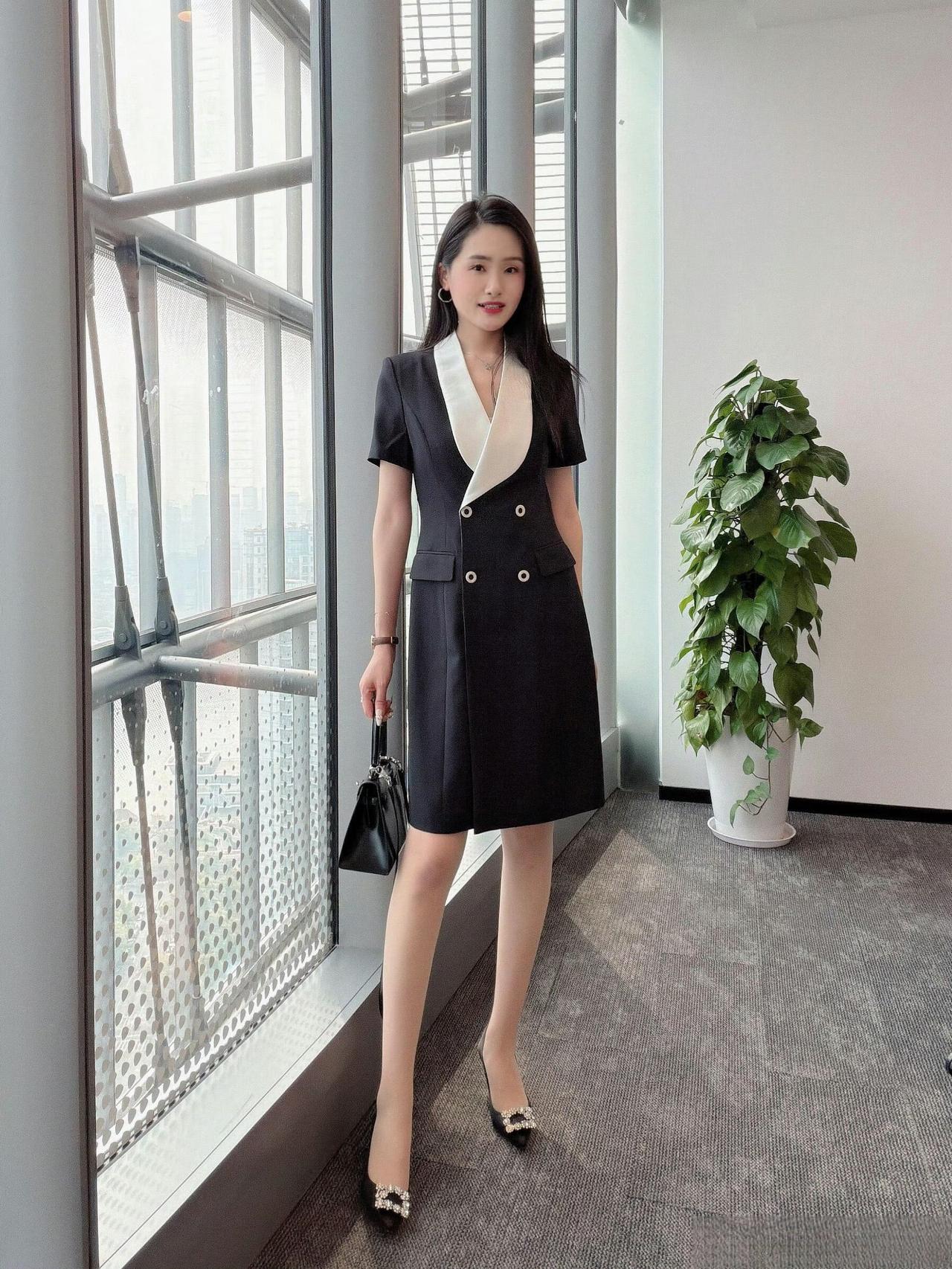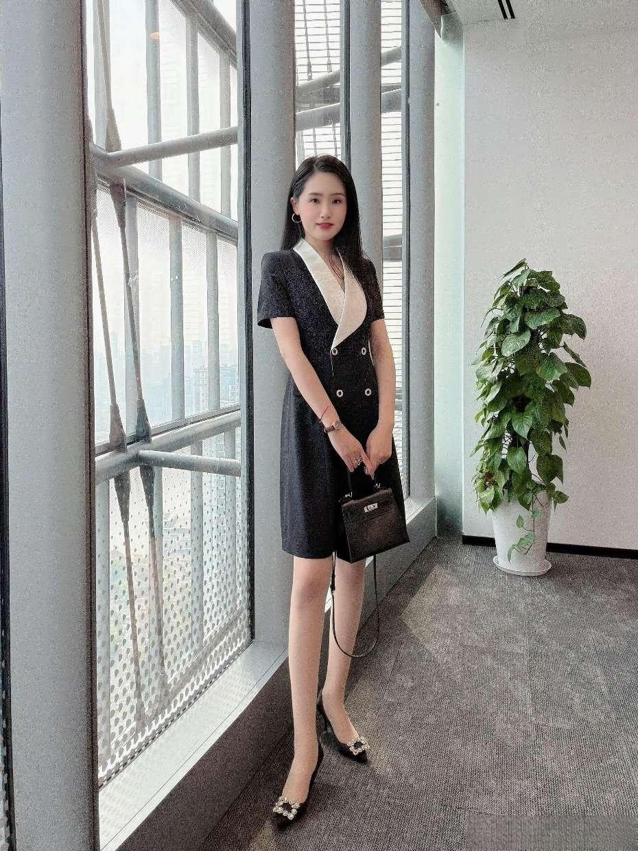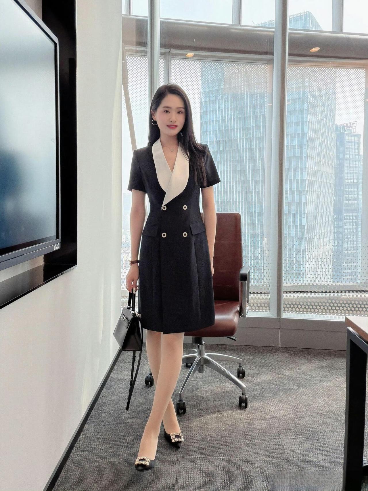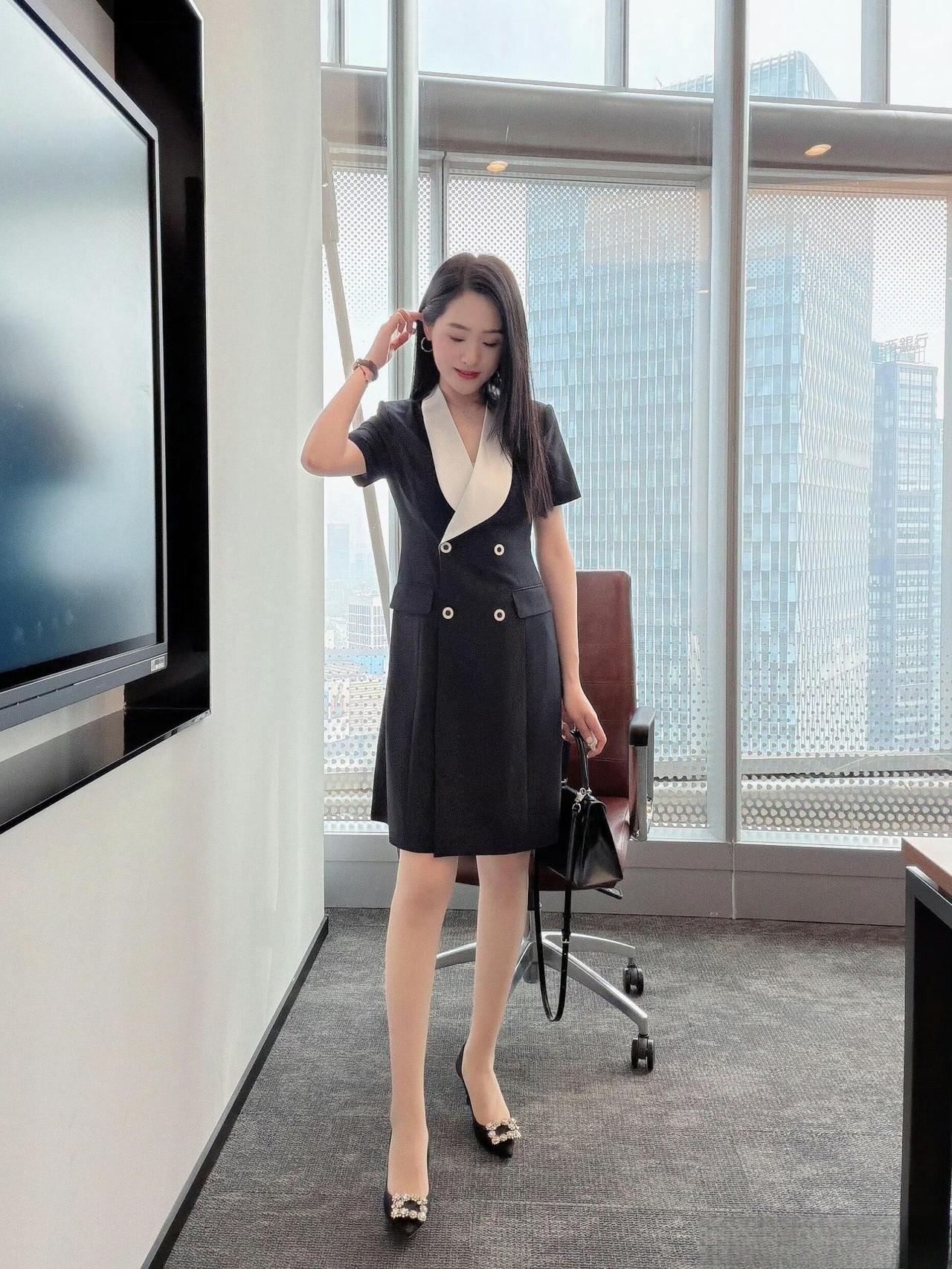 - 单品选了黑底白领双排扣连衣裙,撞色翻领增加设计感,双排扣+收腰版型显干练,短袖适配办公环境;