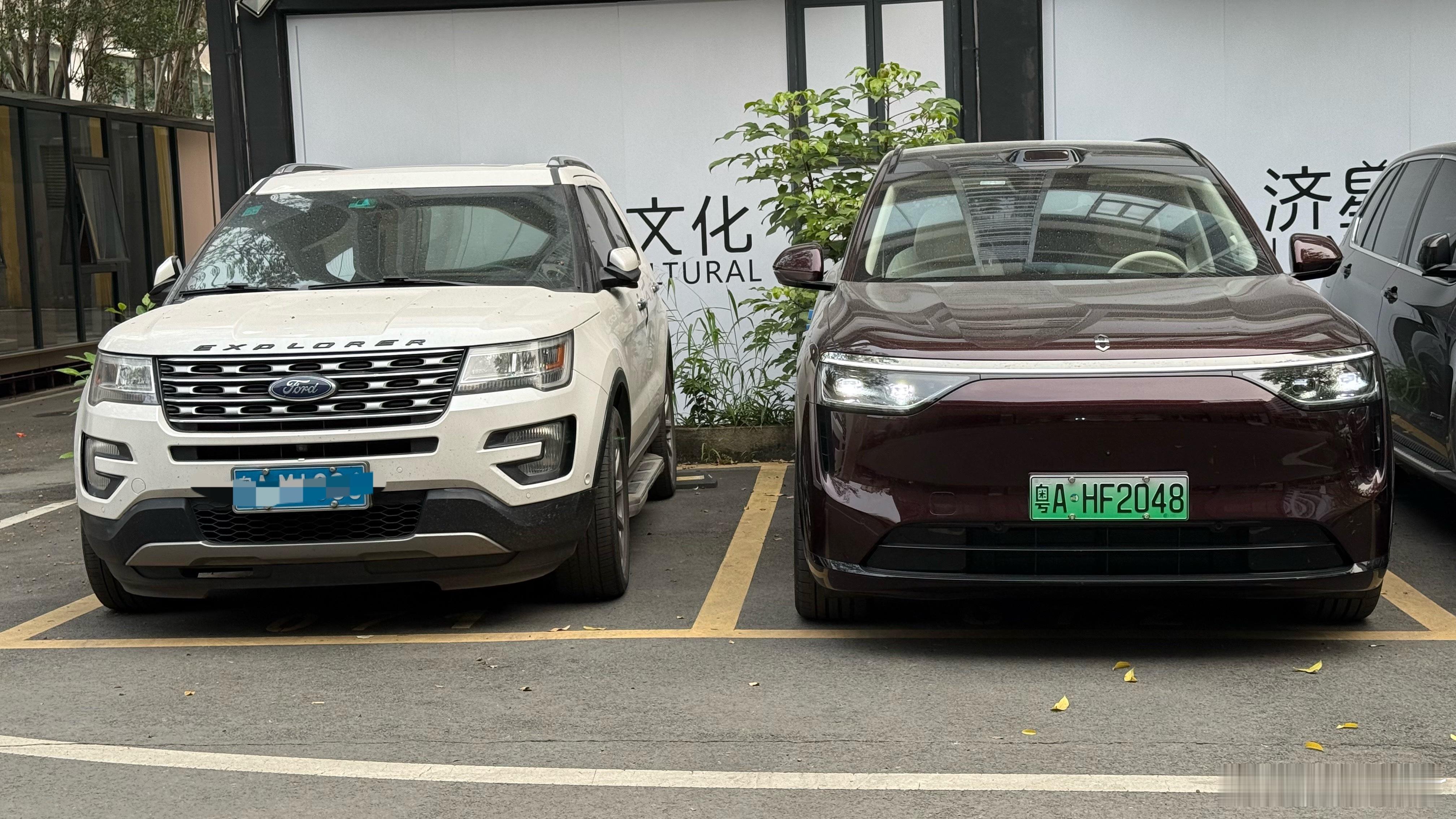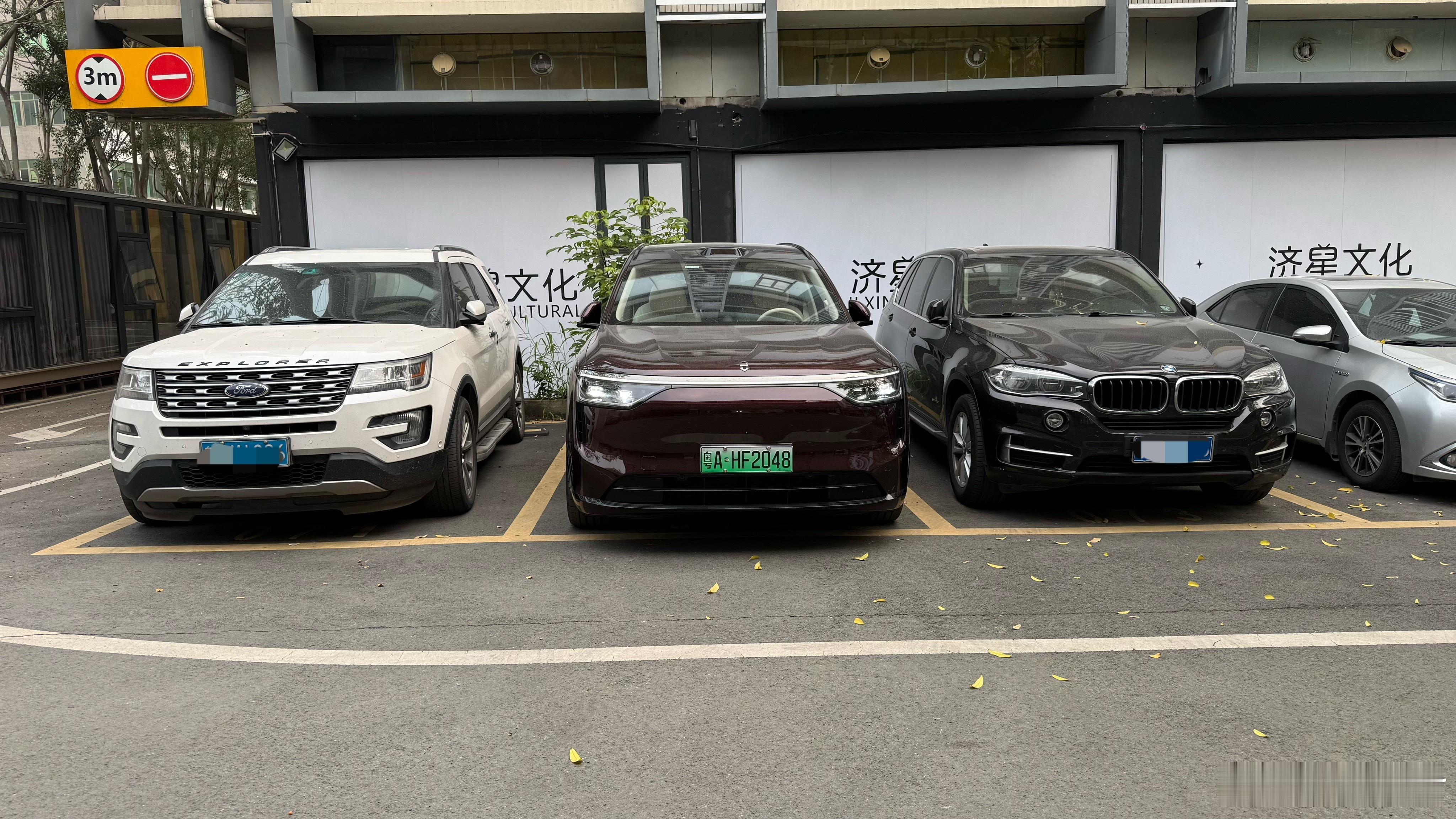 随手拍了一下问界M8 896版和福特探险者、老款宝马X3的体型比较,车子后方有障碍物没完全倒到限位器我与汽车的日常大v聊车问界m8