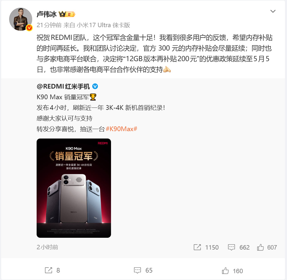 卢伟冰回应K90Max销量冠军“300元的官方补贴尽量延续,12GB版补贴200元延续到5月5日”,就喜欢卢总这种实打实的“加料”回应。