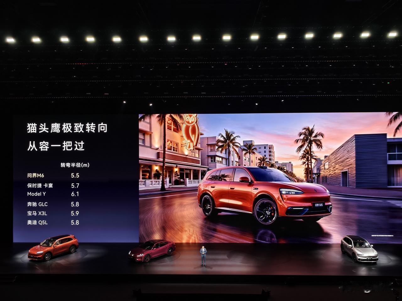 问界M6定位新锐智慧SUV,车身尺寸4960×1985×1736mm,轴距2950mm。整车采用高效空气动力学设计,风阻系数低至0.239cd。