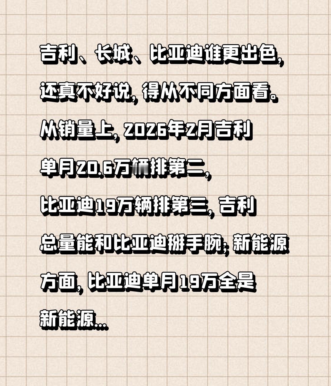 吉利、长城、比亚迪谁更出色,还真不好说,得从不同方面看。 从销量上,2026年2
