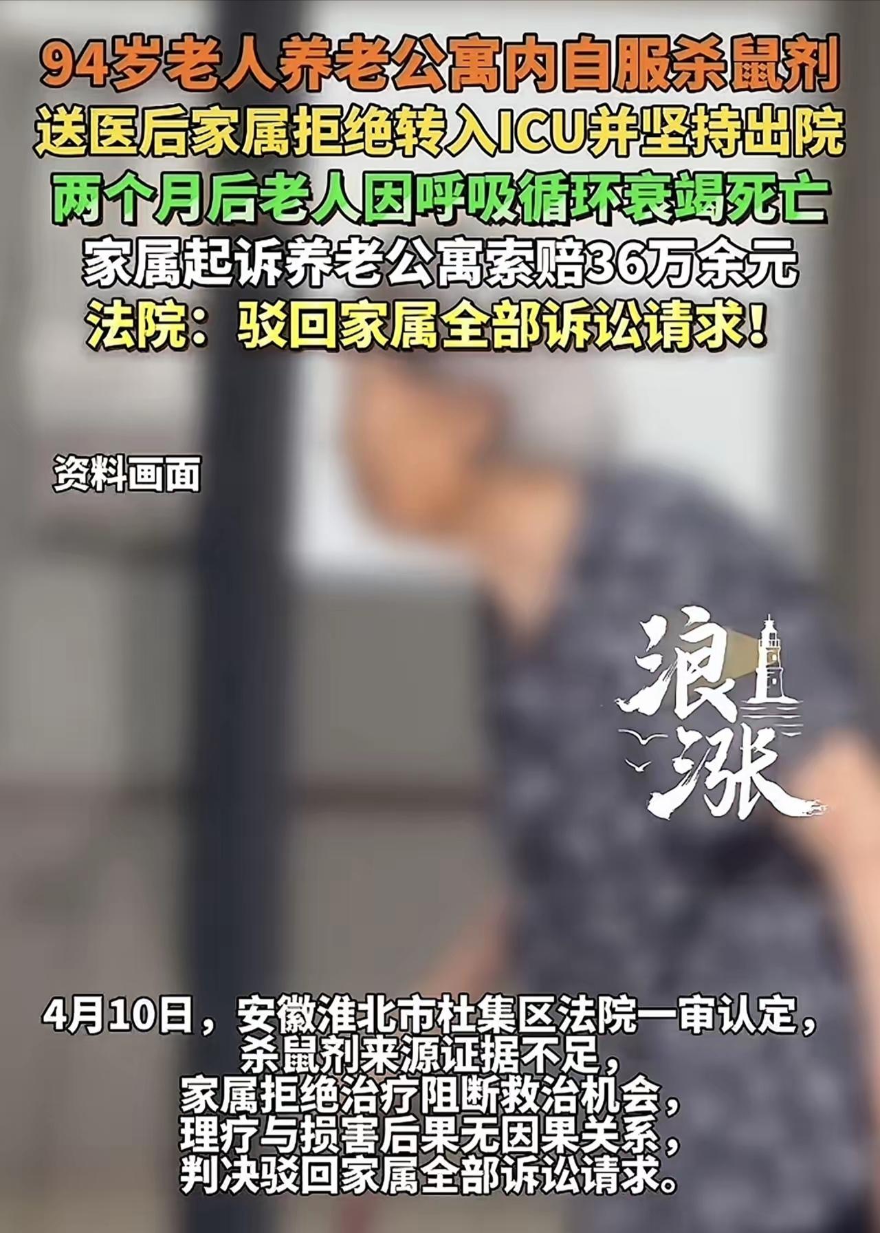 安徽,一94岁老人住养老院,因膝盖疼得受不了,竟吃老鼠药自杀,养老院立即将其送医,岂料,2个儿子却拒绝将老人送到ICU治疗和检查,而是坚持出院,老人不幸死亡,事后2个儿子却向养老院索赔36万。