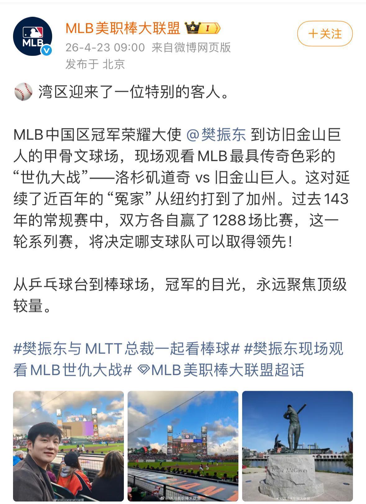 4月23日,MLB美职棒大联盟社媒更新::⚾️ 湾区迎来了一位特别的客人。MLB中国区冠军荣耀大使樊振东到访旧金山巨人的甲骨文球场,现场观看MLB最具传奇色彩的“世仇大战”——洛杉矶道奇 vs 旧金山巨人。从乒乓球台到棒球场,冠军的目光,永远聚焦顶级较量。