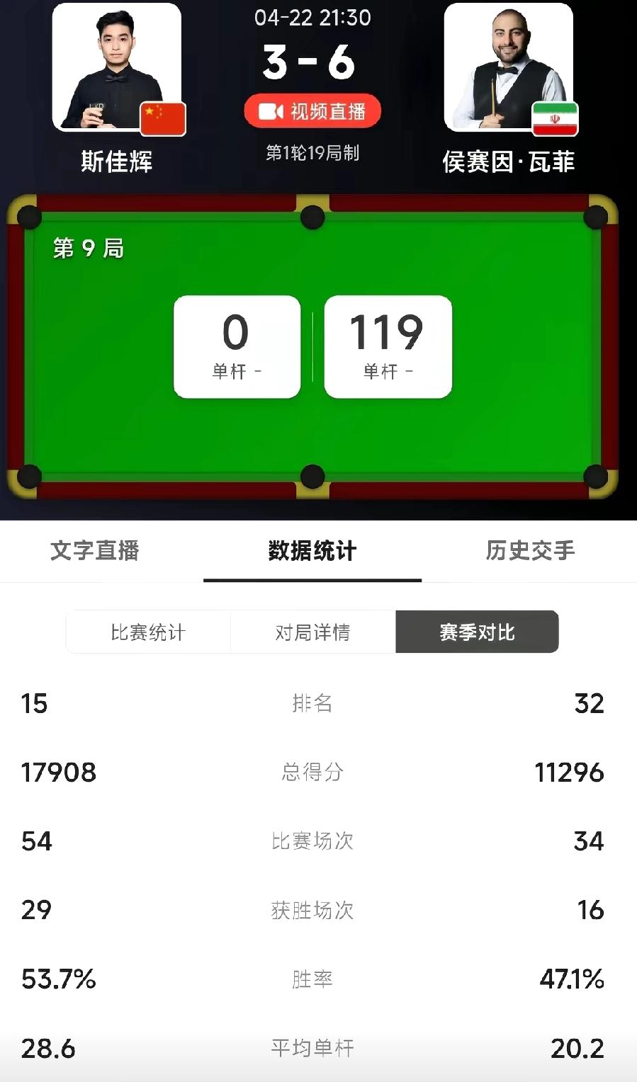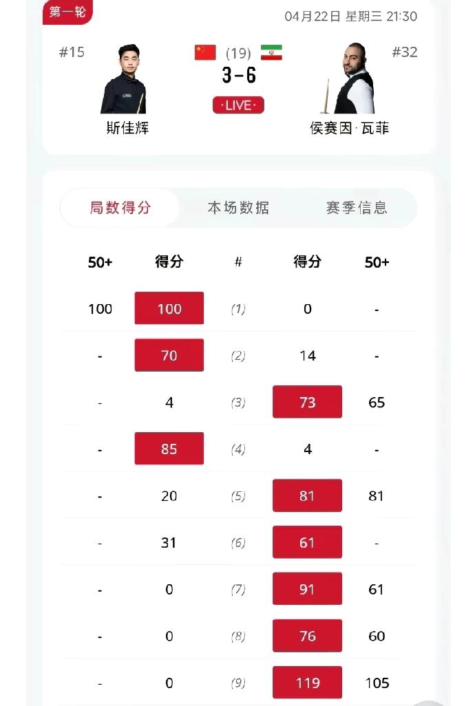 4月22日晚,世锦赛首轮第一阶段,斯佳辉3-1领先后,被瓦菲轰出一波长长五连鞭,你说难受不难受,半夜三更的,不让人好好睡觉。