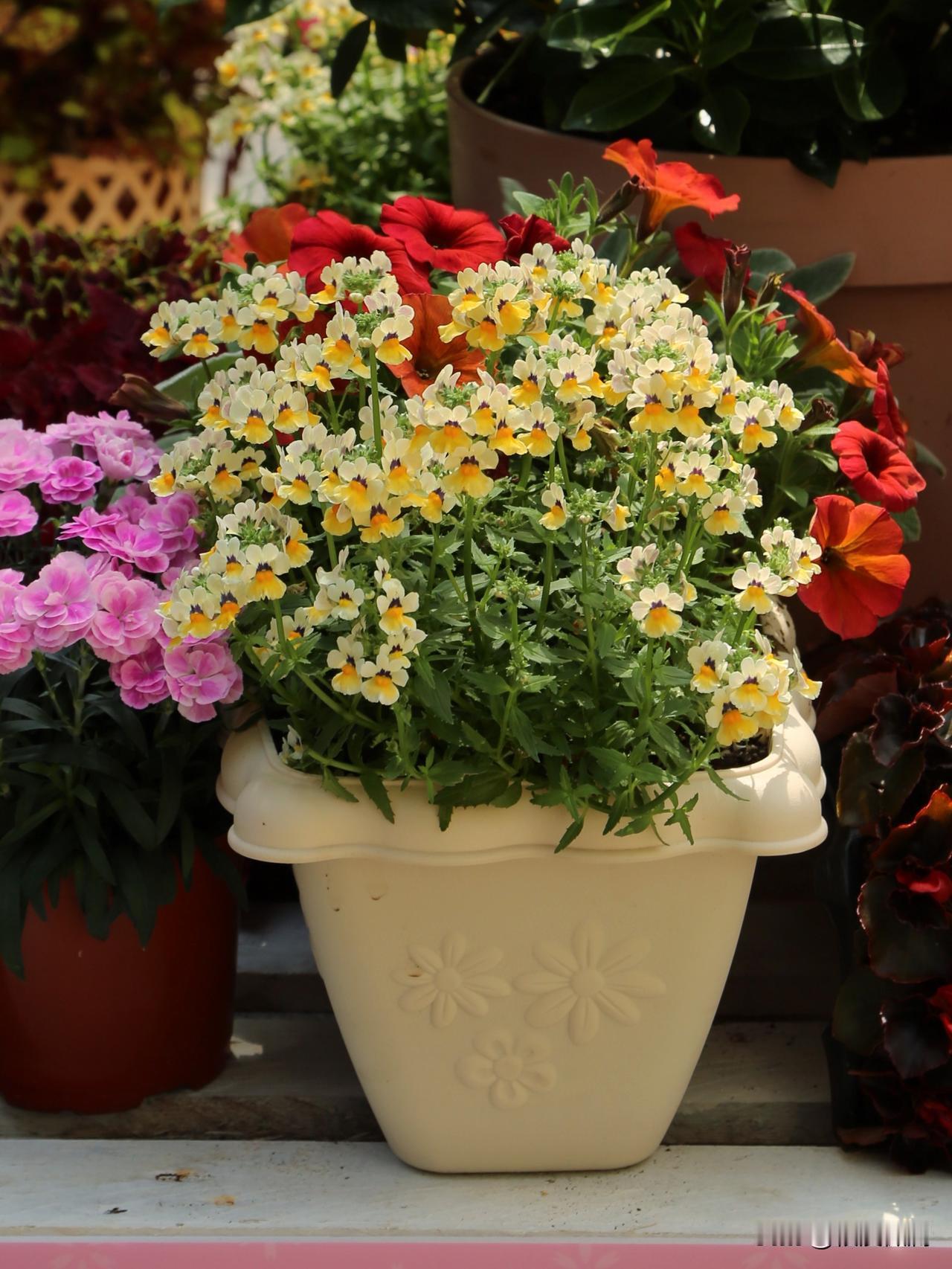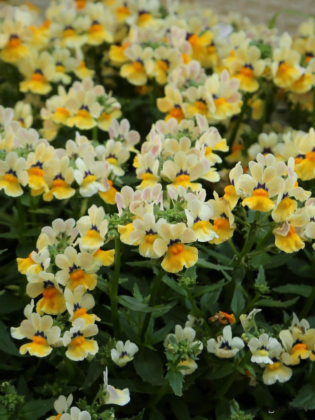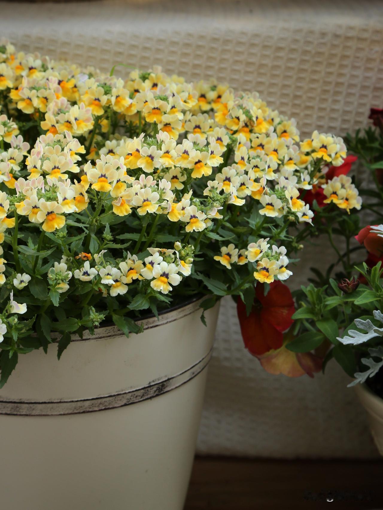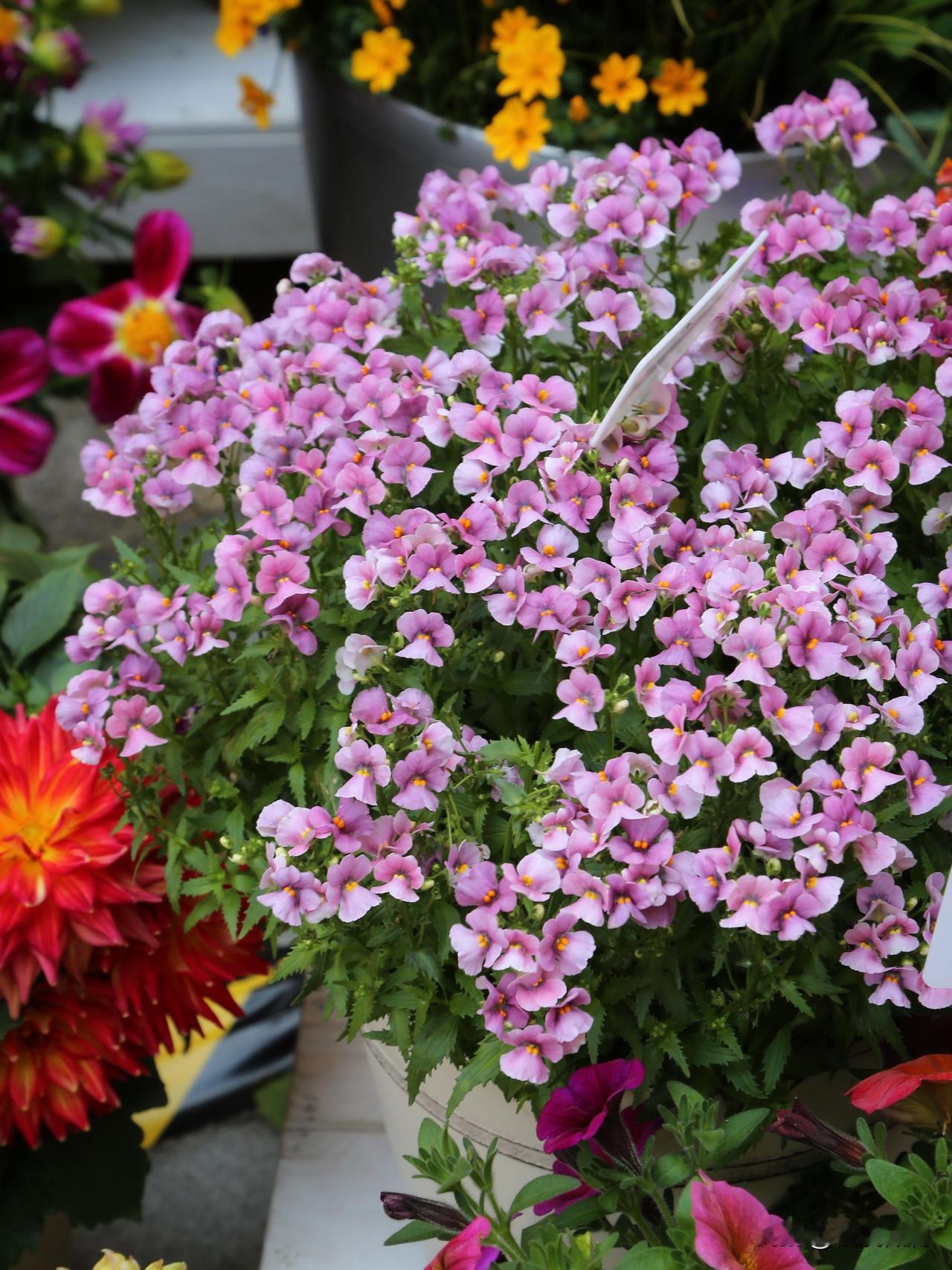 今年有一种叫做“龙面花”的新面孔植物出现在花市上,这次在花展上也见到了。龙面花是玄参科,原产地在南非。花朵分上下两部分,上面像龙角,下面像五官,花心有斑纹,所以取了个中文名叫“龙面花”。它最特殊的地方在于色彩丰富,从白色,黄色,橙色,到粉色,还有渐变色,配成一大盆,显得特别繁华热闹。来自南非的植物,很多都喜欢冷凉的气候,最适宜的温度在15-25度之间,温度一高就不开花了。喜欢阳光,但不能暴晒。在花展上见到的几盆龙面花都很美丽,是装扮花园花境的新宠儿。