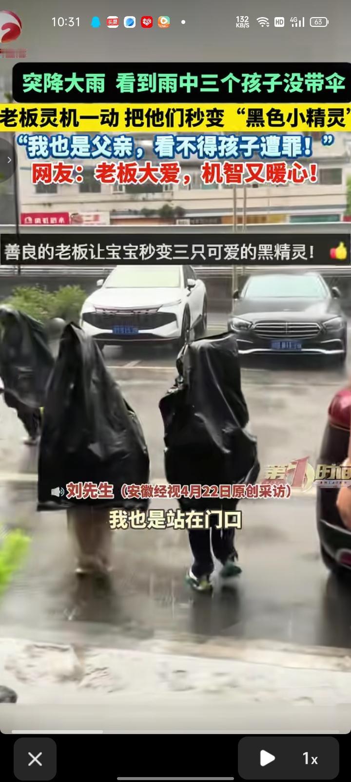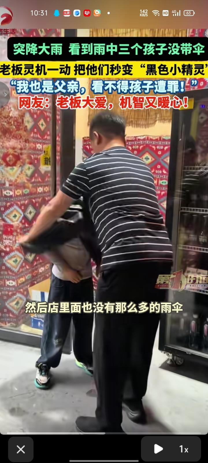 4月19日,四川巴中。突降大雨,在店门口的老板看到雨中三个小孩没带伞,都被雨淋湿了,而且店里没那么多雨伞。于是灵机一动,就给他们套上黑色塑料袋,不让他们淋太多雨,让他们尽快回家。老板表示,我也是父亲,看不得孩子遭罪