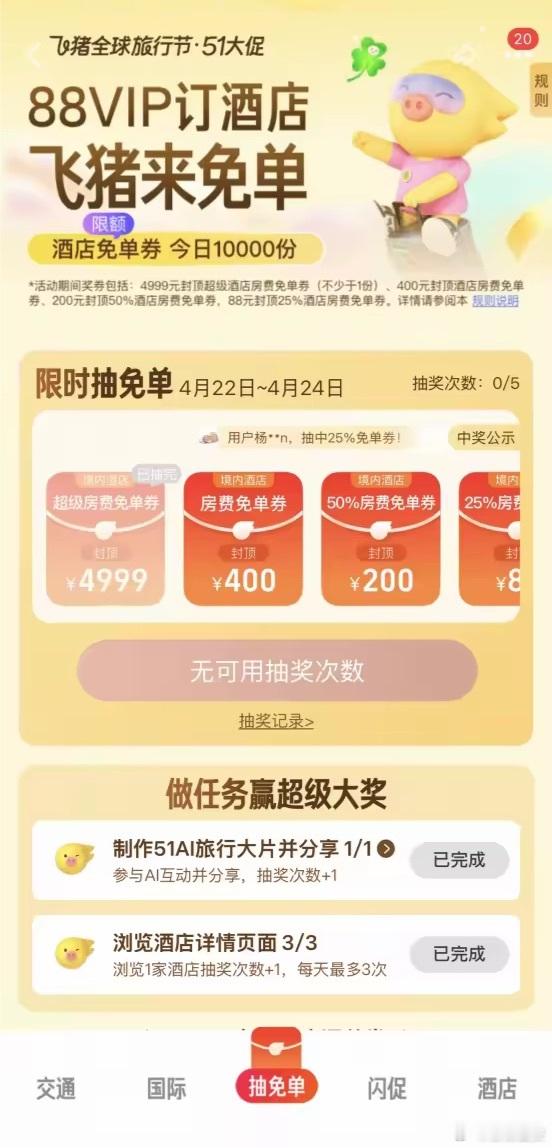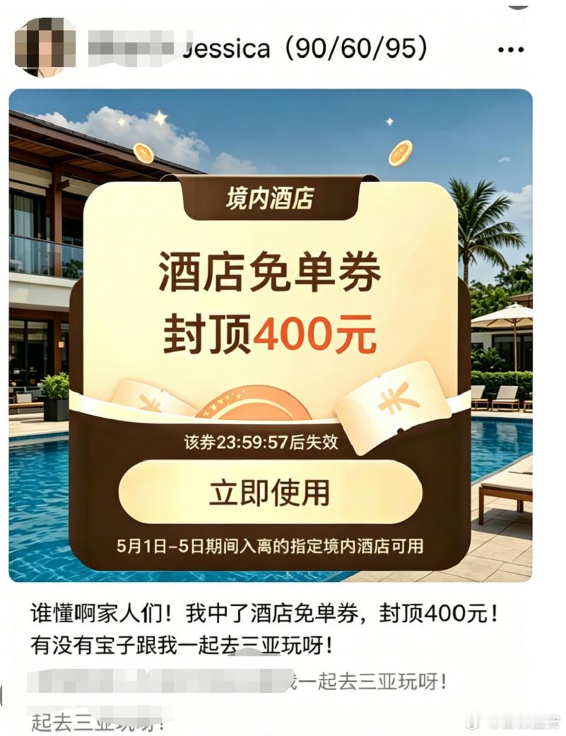 前台女同事今天居然主动凑过来约我五一去三亚!隔十分钟就问一次 “酒店定好了没”,催得我脑壳都疼,这姐们儿怎么突然这么积极?!还好我偷偷翻了她社媒,破案了!合着这货中了 飞猪免单 活动,酒店直接免费,怪不得这么上赶着约我,原来是想拉个伴儿自己白嫖旅行啊我就惨了,只中了个早餐券,这要是陪她去,不纯纯大冤种吗!还好活动 4.22-4.24 还没结束,每天下午 2 点上飞猪搜【飞猪免单】就能参与竞猜,酒店、机票都有机会免,三亚也在免单城市里。我先默默猜好答案,心里就盼着能中!先不答应她,等我也中了免单再一起去,绝不做花钱陪玩的大冤种