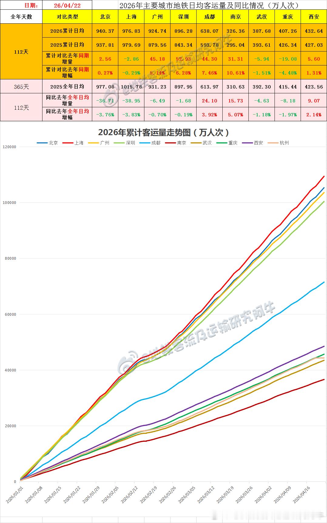 【中国城市地铁客流排行榜 2026-04-22(周三,农历三月初六,中国地铁客流日报】主榜风云:18城争霸,沪深双榜!——深圳春节后(周一至周四的)普通工作日终于首次攻破千万(1000.73万,上周三是999.96万)。上海地铁北京地铁深圳地铁广州地铁成都地铁西安地铁重庆轨道交通武汉地铁南京地铁(南京地铁S2号线 开通首日)长沙地铁郑州地铁沈阳地铁天津地铁苏州地铁合肥地铁青岛地铁宁波地铁哈尔滨地铁地铁客流及运输研究阿牛的微博