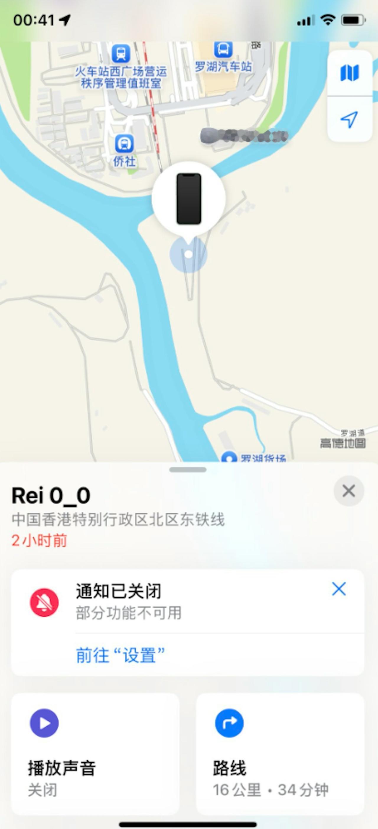 回家后,登录Apple ID帐号,发现其手机于晚上10时在香港北区东铁线断联,已报警处理,但相信找回手机机会不大,“因为没出境流量,所以到了出入境就没办法定位了 目前手机已经关机”。