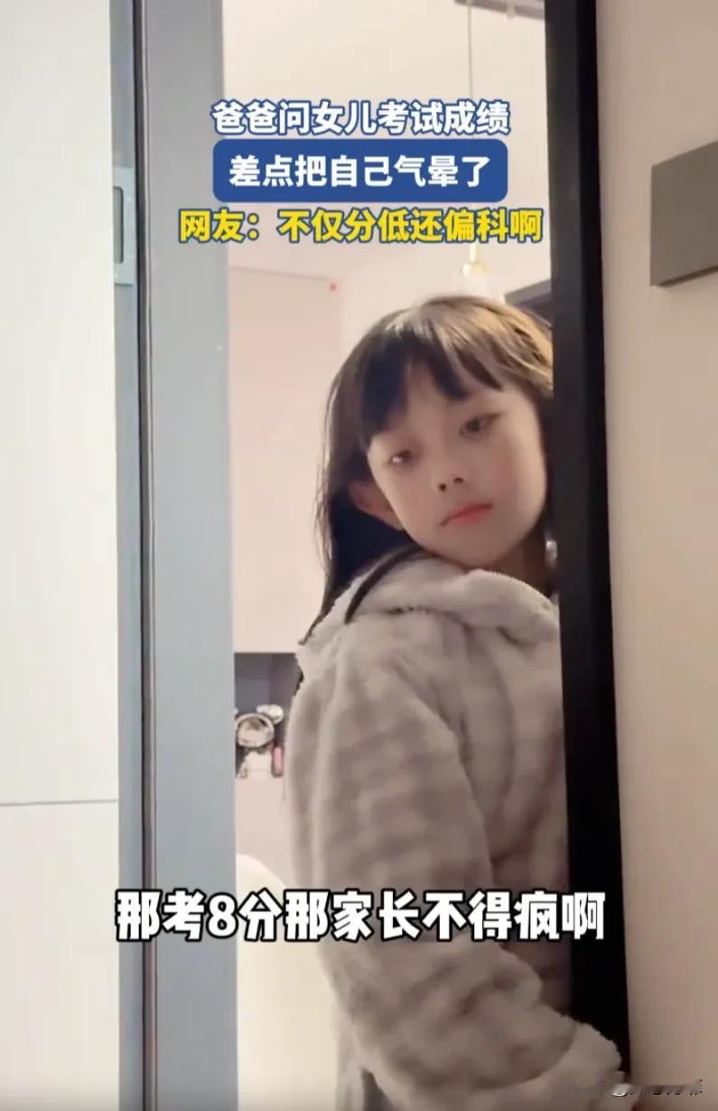 女儿:“8分。”爸爸:“哎呀妈呀,你这35分我都要崩溃了,那考8分,家长不得疯啊。”女儿还试图安慰爸爸,那不是数学是语文,可爸爸表示,那也不能考8分,还问女儿这个同学是谁。