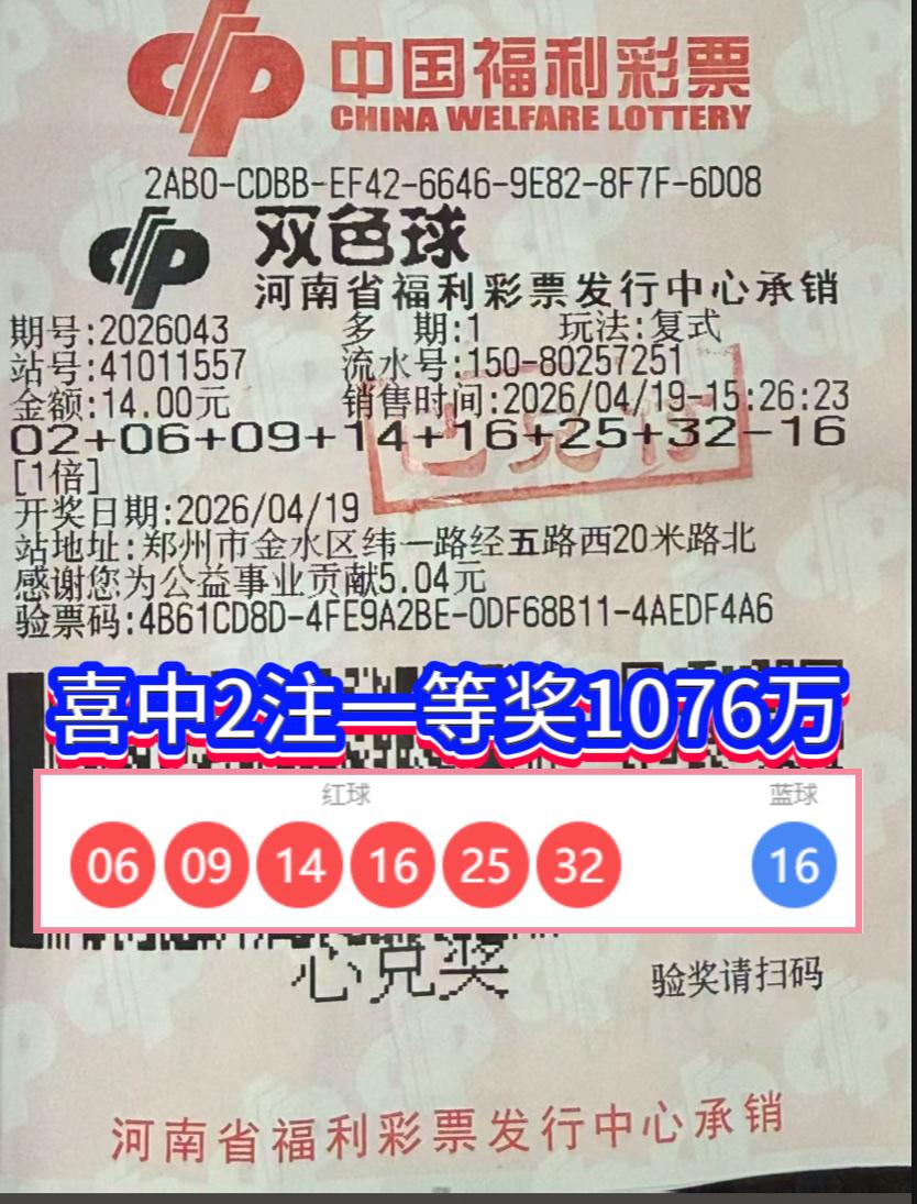 4月19日晚,双色球2026043期开奖,郑州一位彩民创造了令人羡慕的幸运时刻:他在同一网点,间隔10秒打出两张号码完全相同的7+1复式票,合计仅投入28元,就一举拿下2注一等奖,揽获总奖金1076万元!