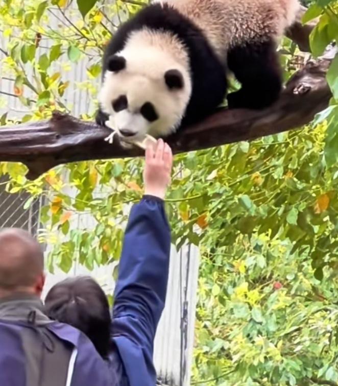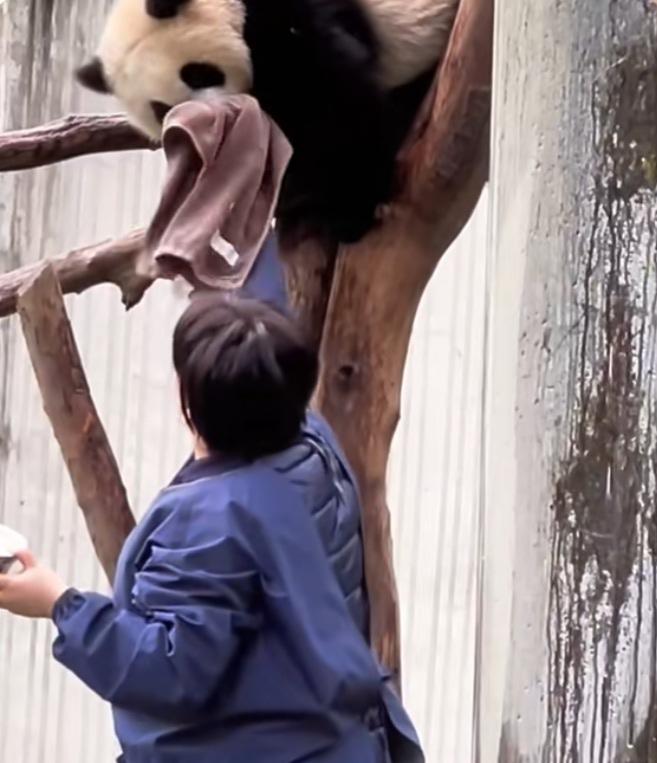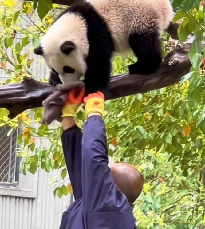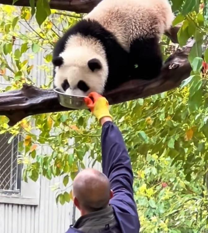 南小月幼崽好幸福呀,它在树上待着,不想下来,奶妈奶爸就伸直手臂给它把盆盆奶递到嘴边,它低头下来喝就行了!喝完了,奶妈奶爸又伸长手臂用帕子给它擦嘴,擦得干干净净的!给它擦完嘴,又往它嘴里递剥好的鲜嫩多汁的大笋片儿,它根本不用下树就喝到了香香的盆盆奶,吃到了美味的笋片,这日子过得太巴适了吧,奶妈奶爸太有爱心了,心地非常善良![比心][赞]南小月幼崽 熊猫 大熊猫 国宝 守护国宝大熊猫 (cr:@洋姐看熊猫🐼)