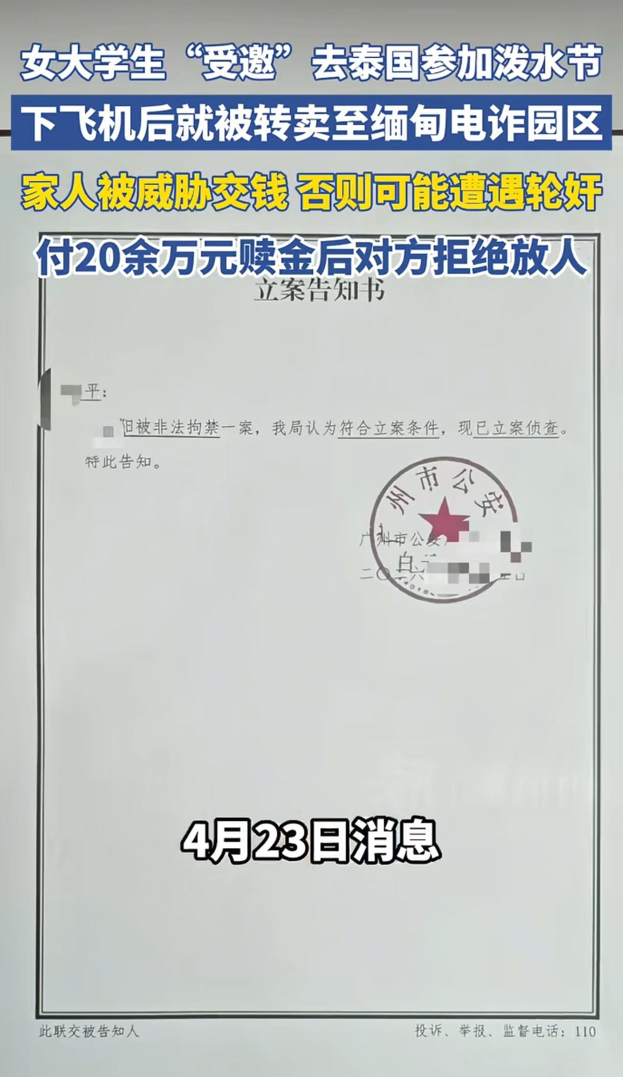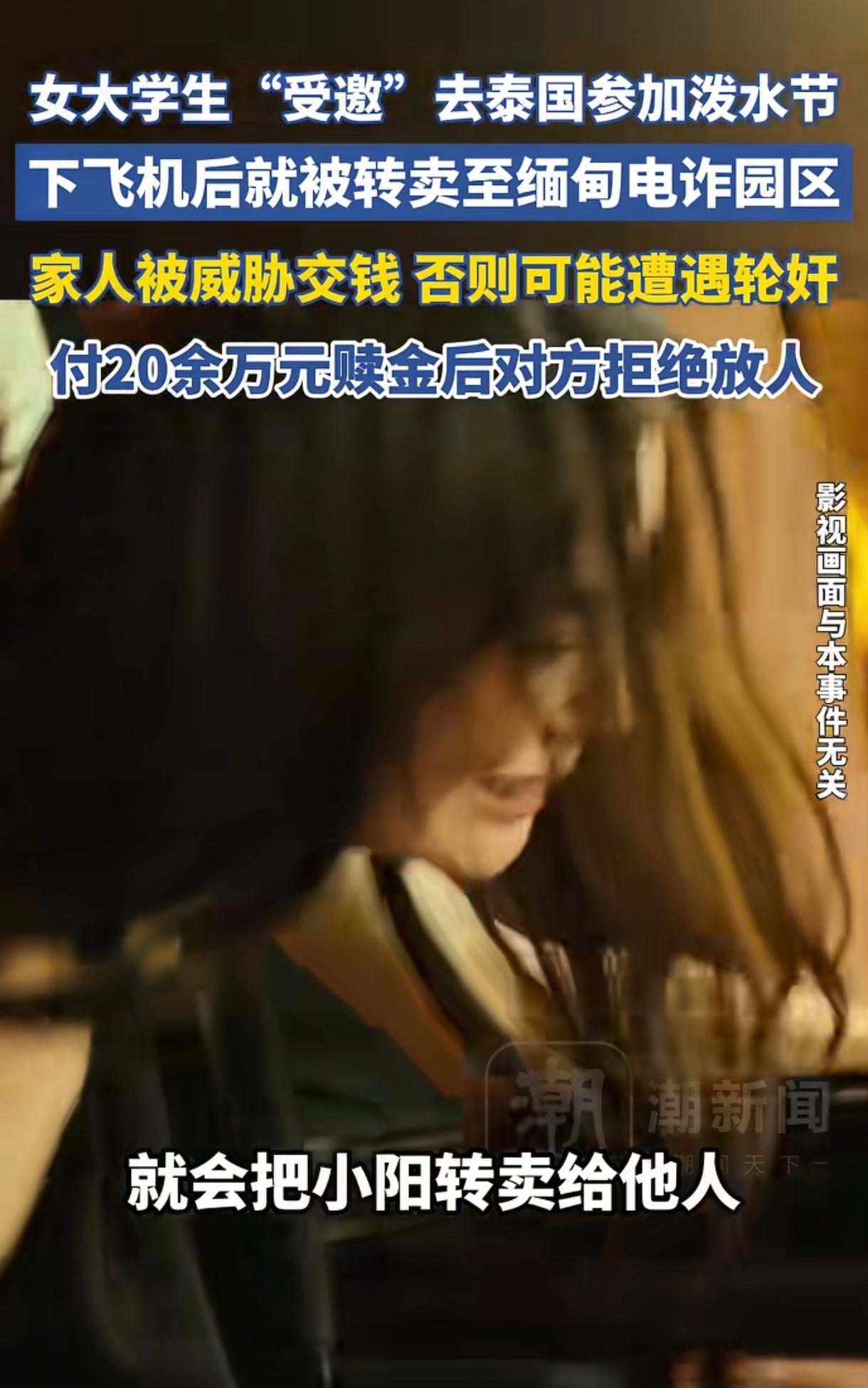 “太恶劣了!”19岁广东女大学生被朋友邀请去泰国过泼水节,不料刚下飞机就被控制并转卖到缅甸电诈园区,父母被威胁拿20万放人不然就轮奸,但父母转了钱,对方却没放人。