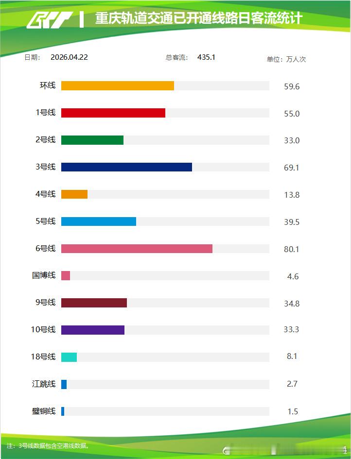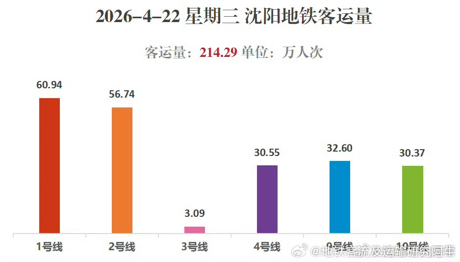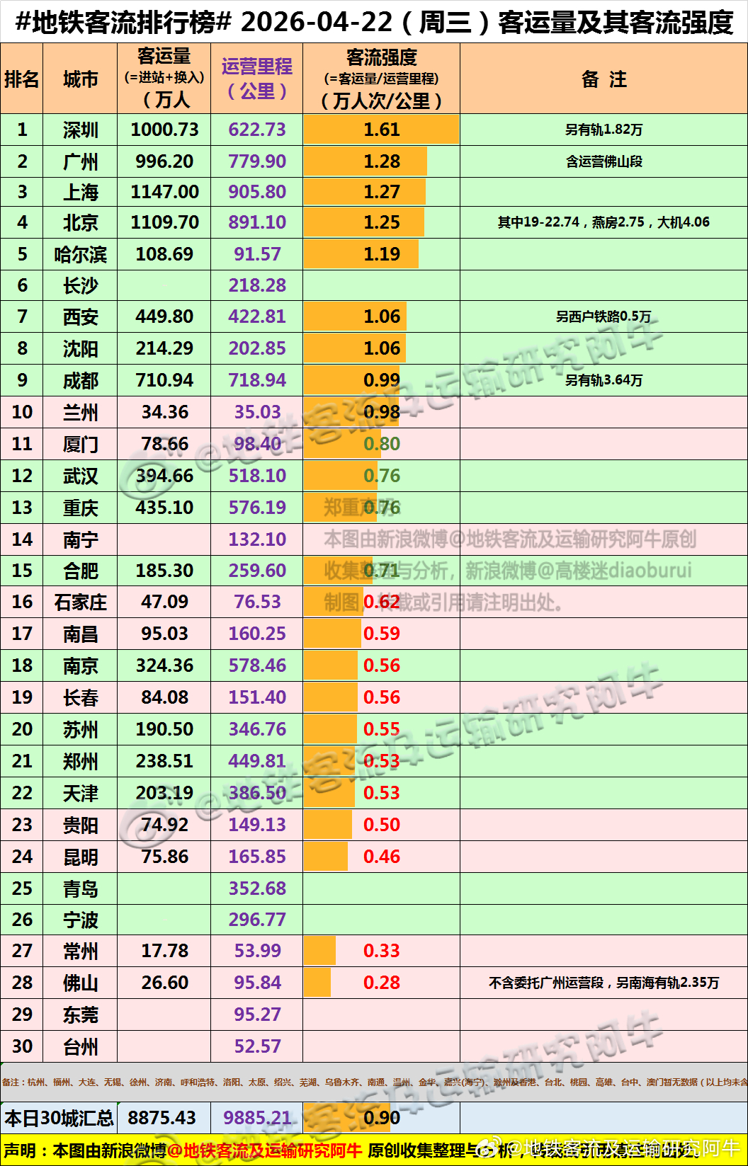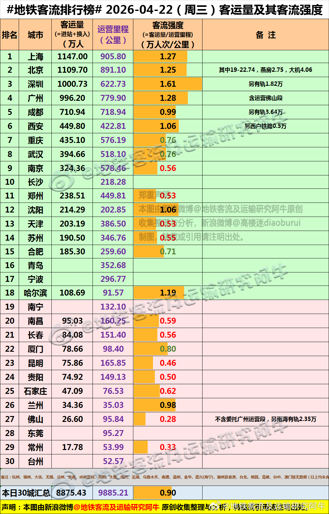 【中国城市地铁客流排行榜 2026-04-22(周三,农历三月初六,中国地铁客流日报】上海1147万,北京1109.70万(其中19-22.74,燕房2.75,大机4.06),深圳1000.73万(另有轨1.82万),广州996.2万,成都713.42万(另有轨3.64万),西安449.8万(另西户铁路0.5万),重庆435.1万,武汉394.66万,……余见下表(1-客运量排序,2-客流强度排序)上海地铁北京地铁深圳地铁广州地铁成都地铁西安地铁重庆轨道交通武汉地铁南京地铁地铁客流及运输研究阿牛的微博