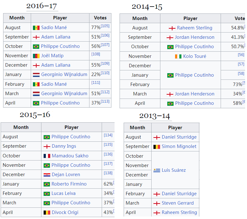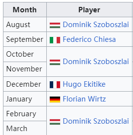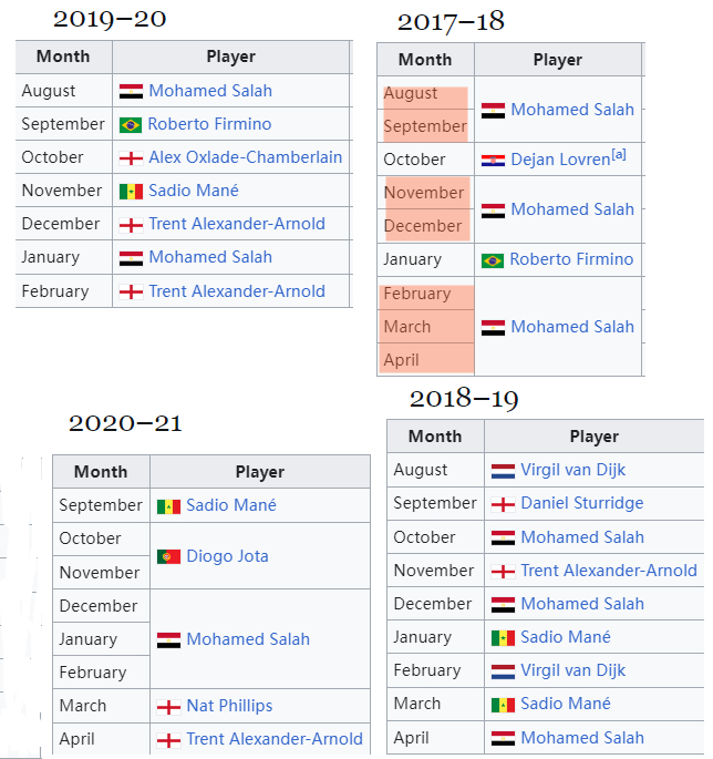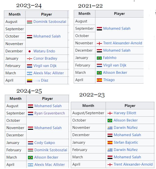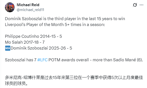 索博本赛季第五次当选渣打最佳,17-18赛季的萨拉赫曾7次获奖