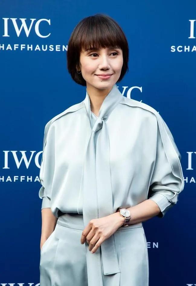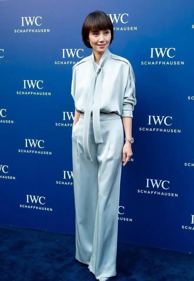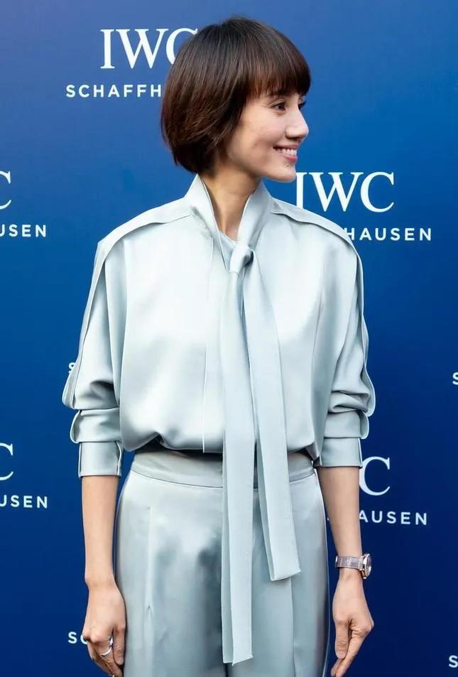 一身同色系缎面套装,低饱和的灰蓝色自带清冷滤镜,垂坠感的系带衬衫搭配高腰阔腿裤,利落又松弛,完全没有多余的设计,却把优雅和干练平衡得刚刚好。搭配简单的腕表和短发,整个人的气质干净又舒展,这才是中年女性最迷人的状态。