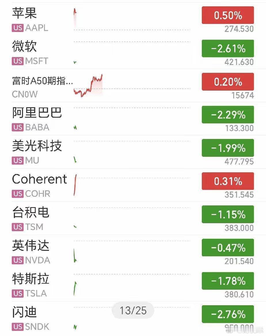 4月23日晚间美股盘中交易简报北京时间4月23日21:38美股盘中数据显示,三大指数低开震荡、小幅下跌,市场情绪谨慎,整体呈普跌格局。其中道琼斯指数报49300.95点,跌0.38%;纳斯达克指数报24574.17点,跌0.34%;标普500指数报7122.91点,跌0.21%。市场下跌家数3425家,上涨家数2996家,空头力量稍占上风。个股层面科技股分化明显,AI算力、半导体板块迎来回调。微软、闪迪、美光科技跌幅居前,存储芯片板块遭短期抛压,中概股阿里巴巴同步走弱,特斯拉也出现小幅下跌。苹果逆势上涨,展现防御属性,黄金品种同样走强,避险情绪逐步升温。关联市场方面,富时A50期指上涨0.20%,明日A股开盘或相对平稳,受美股科技股调整影响有限。整体来看,当前美股高估值科技板块迎来获利回吐,避险资产受资金青睐,美股科技板块波动,或对A股相关题材股带来短期情绪影响,需理性看待市场震荡。股票股市分析