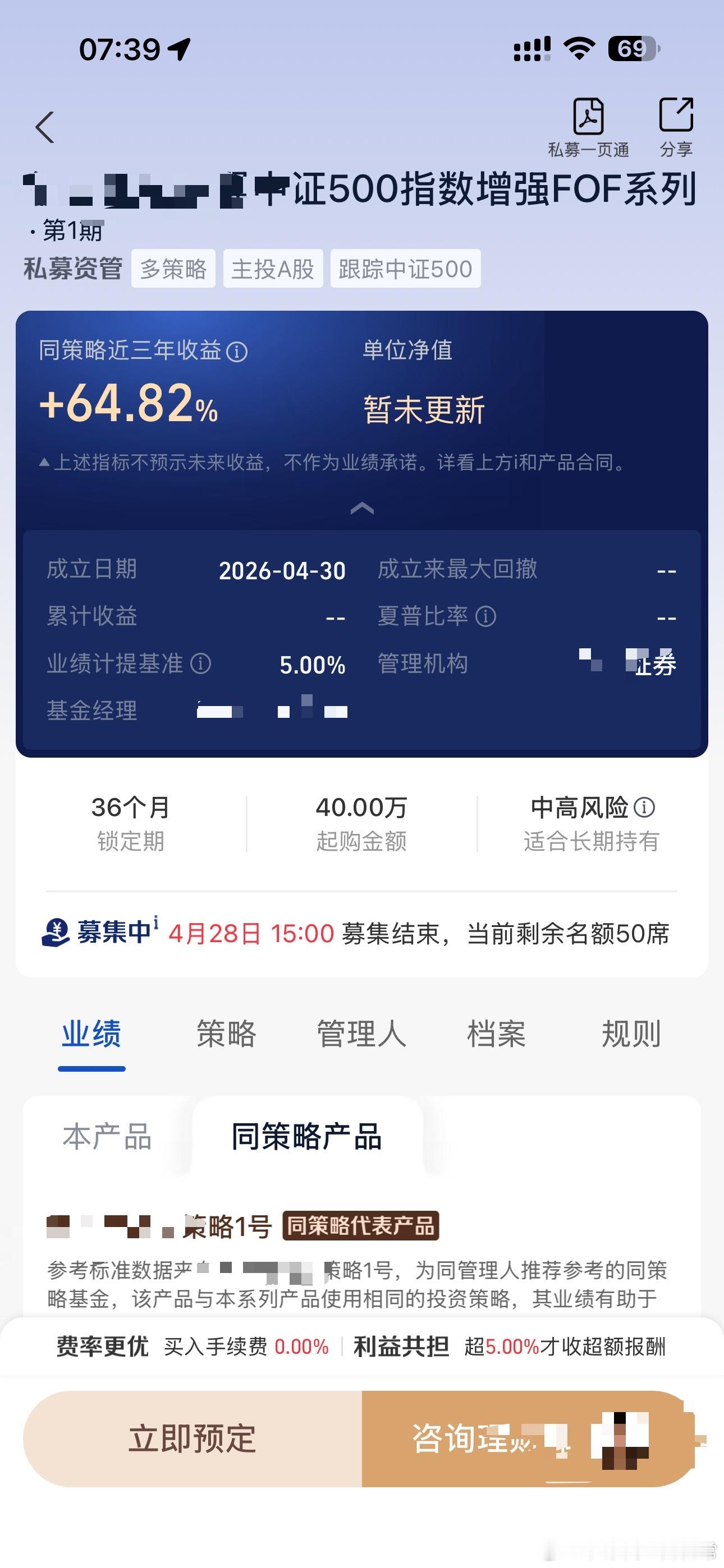 客户经理给我发的产品业绩是某私募中证500指增策略(业绩还只到去年9月,营销材料半年不更新),但实际推过来的产品是号称投资该私募的某券商管理的“同策略”私募FOF产品,不光锁定3年,还要重复收费收carry,唯一的便利就是投资门槛降低到40万了。我都不用问,问了他肯定说:你自己买那个私募是拿不到份额的,我们FOF能拿到。现在我对卖私募FOF的话术很熟了,以后可以转行去做销售了。