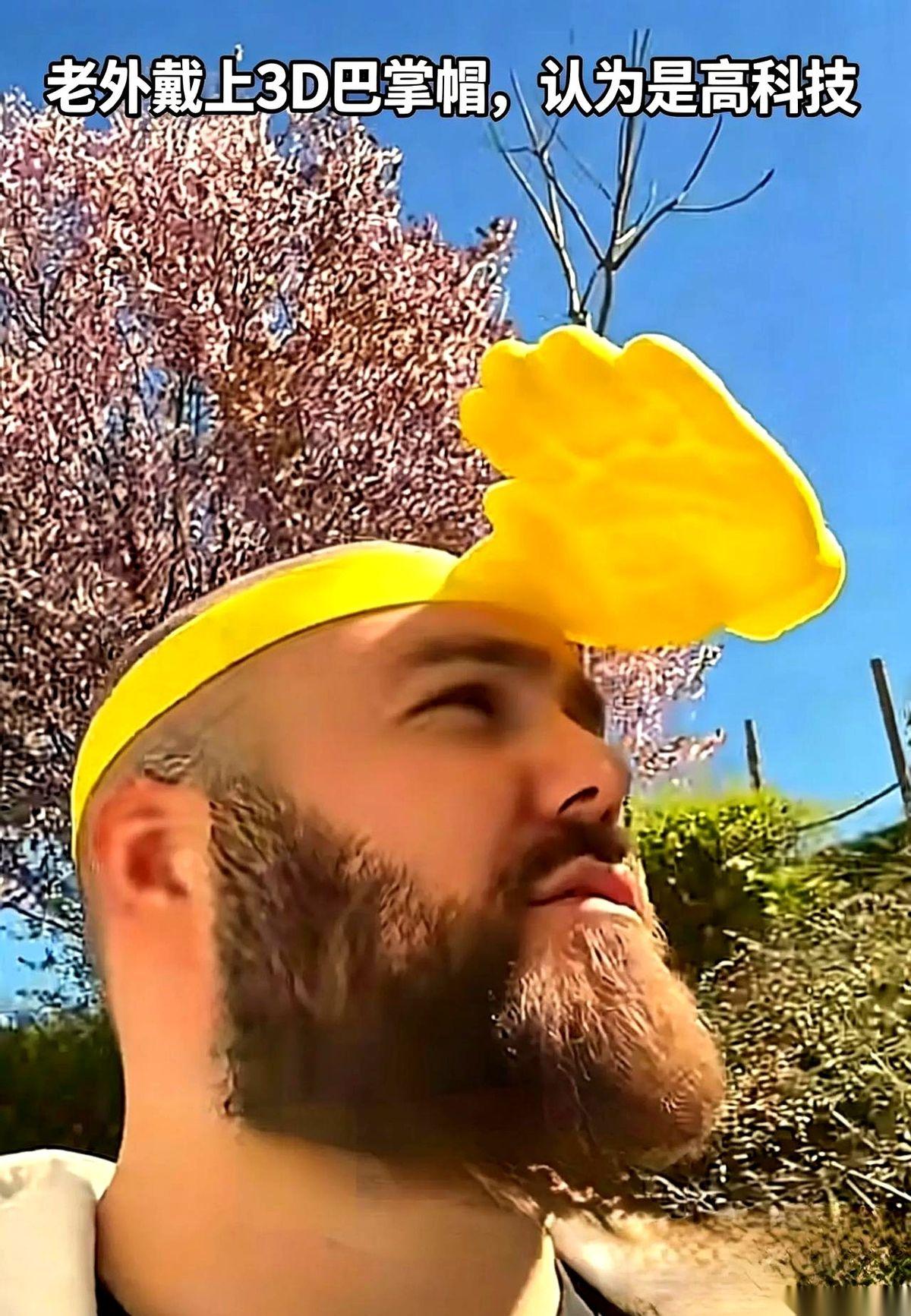 国外一哥们,举着个3D打印的“巴掌帽”在网上炫耀。 镜头怼得特写,他一脸自豪:“
