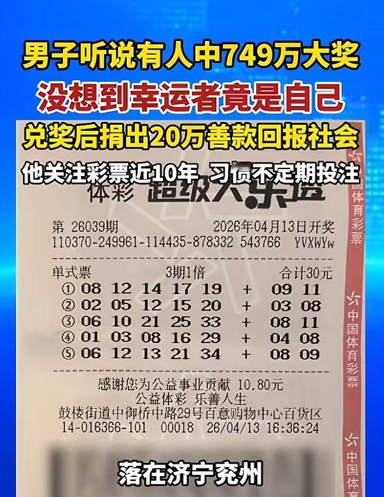 “这就是命啊!”山东济宁,一男子买了张彩票,周末的时候听说有人中了一等奖749.24万,他还在想是谁这么幸运,没想到一核对,发现中奖的是自己!他和家人办了兑奖手续,等领完奖以后,还捐了20万回报社会!网友:羡慕哭了!