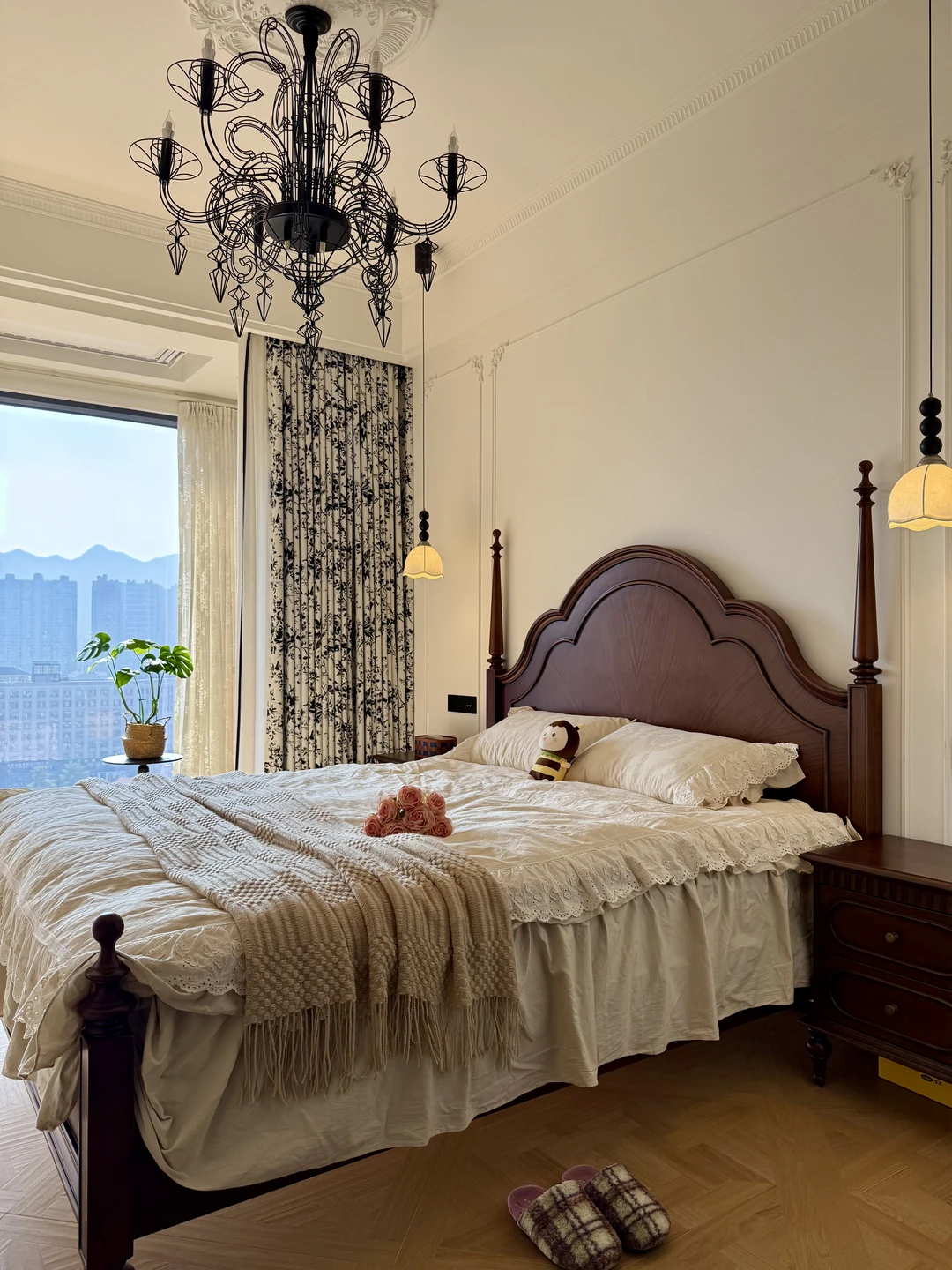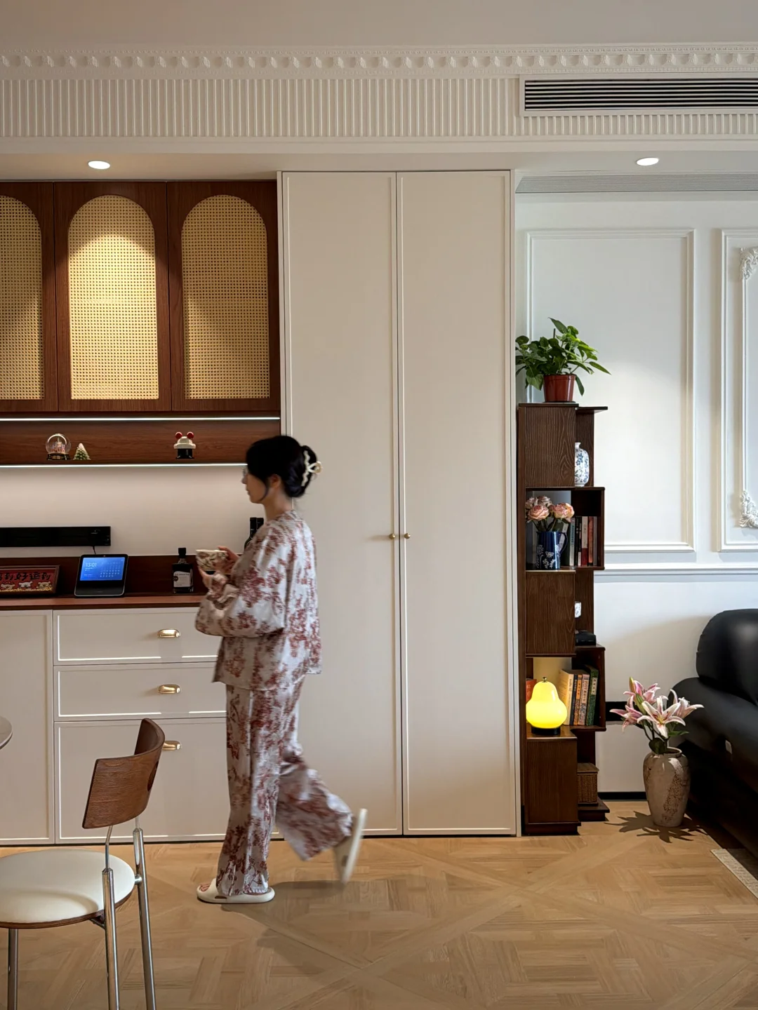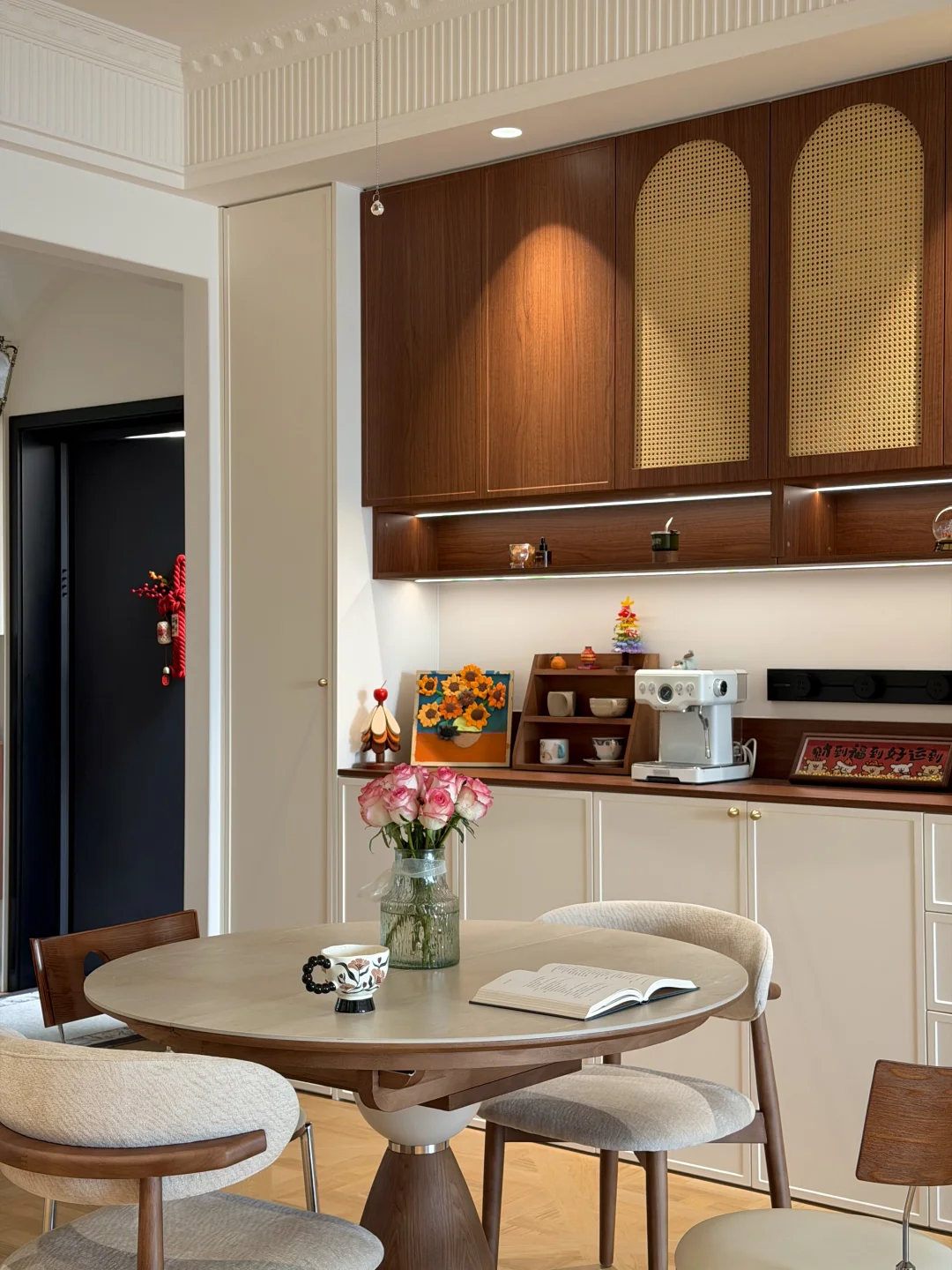 沙发选了深色皮质,电视柜是胡桃木色,它们像锚点,让整个家沉静下来。餐厅放一张中古风餐边柜和圆桌,日常够用,也耐看。卧室做了整排法式床尾柜,搭配棕色实木床,暖白与木色交织,安安静静,就很舒服。