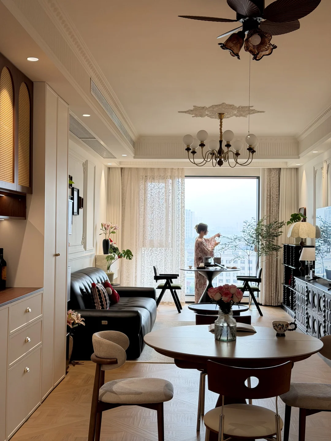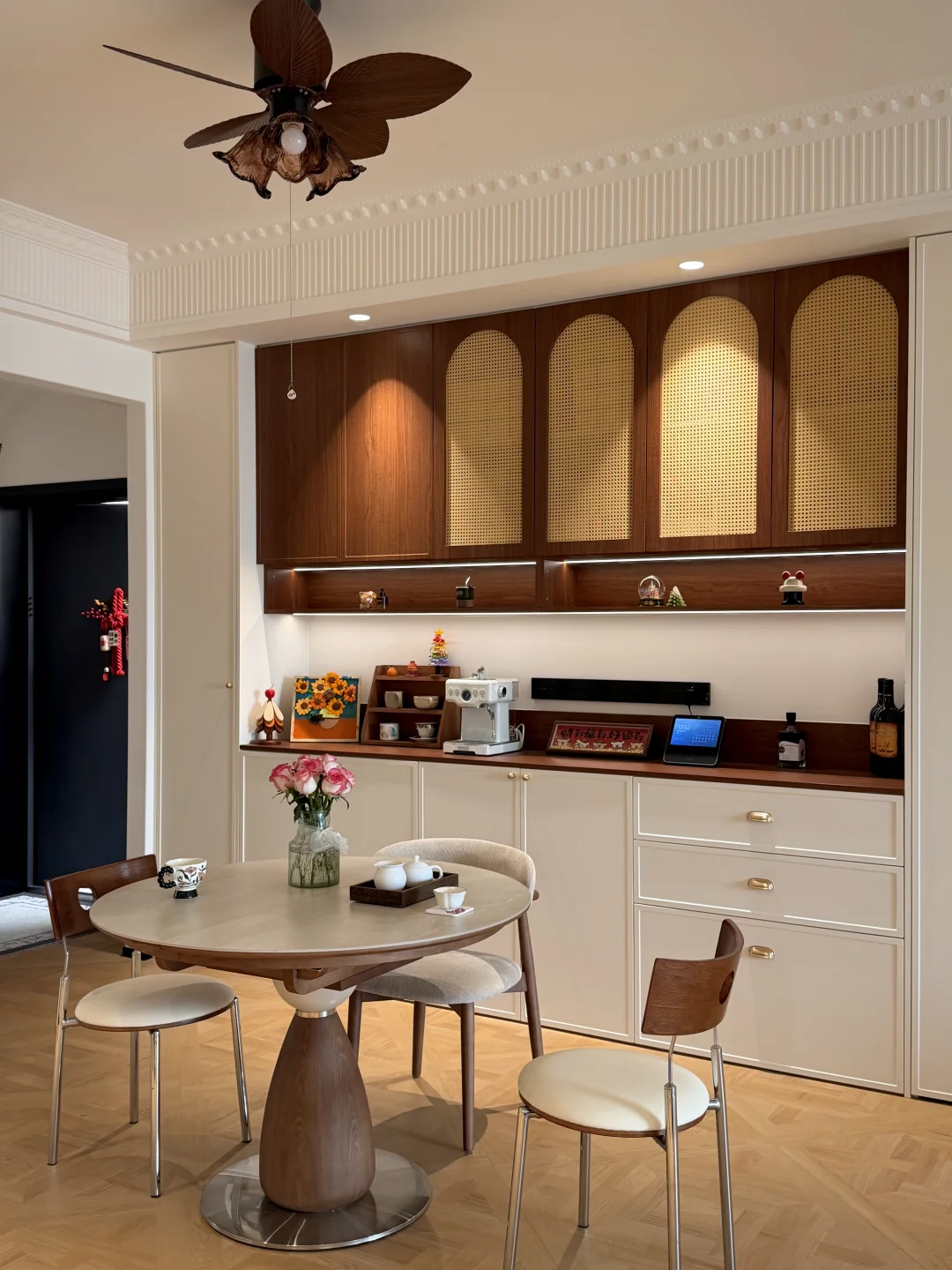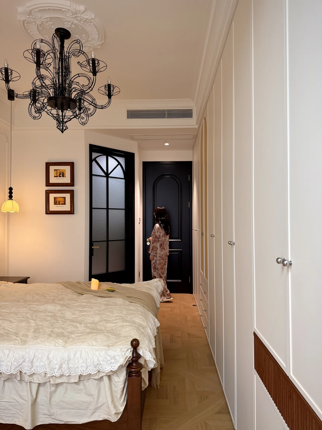 沙发选了深色皮质,电视柜是胡桃木色,它们像锚点,让整个家沉静下来。餐厅放一张中古风餐边柜和圆桌,日常够用,也耐看。卧室做了整排法式床尾柜,搭配棕色实木床,暖白与木色交织,安安静静,就很舒服。