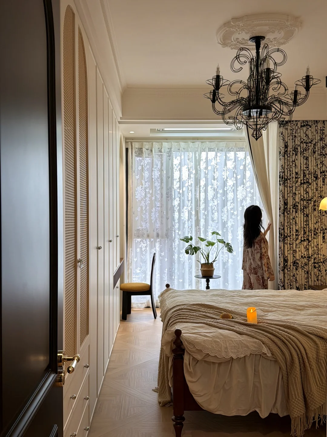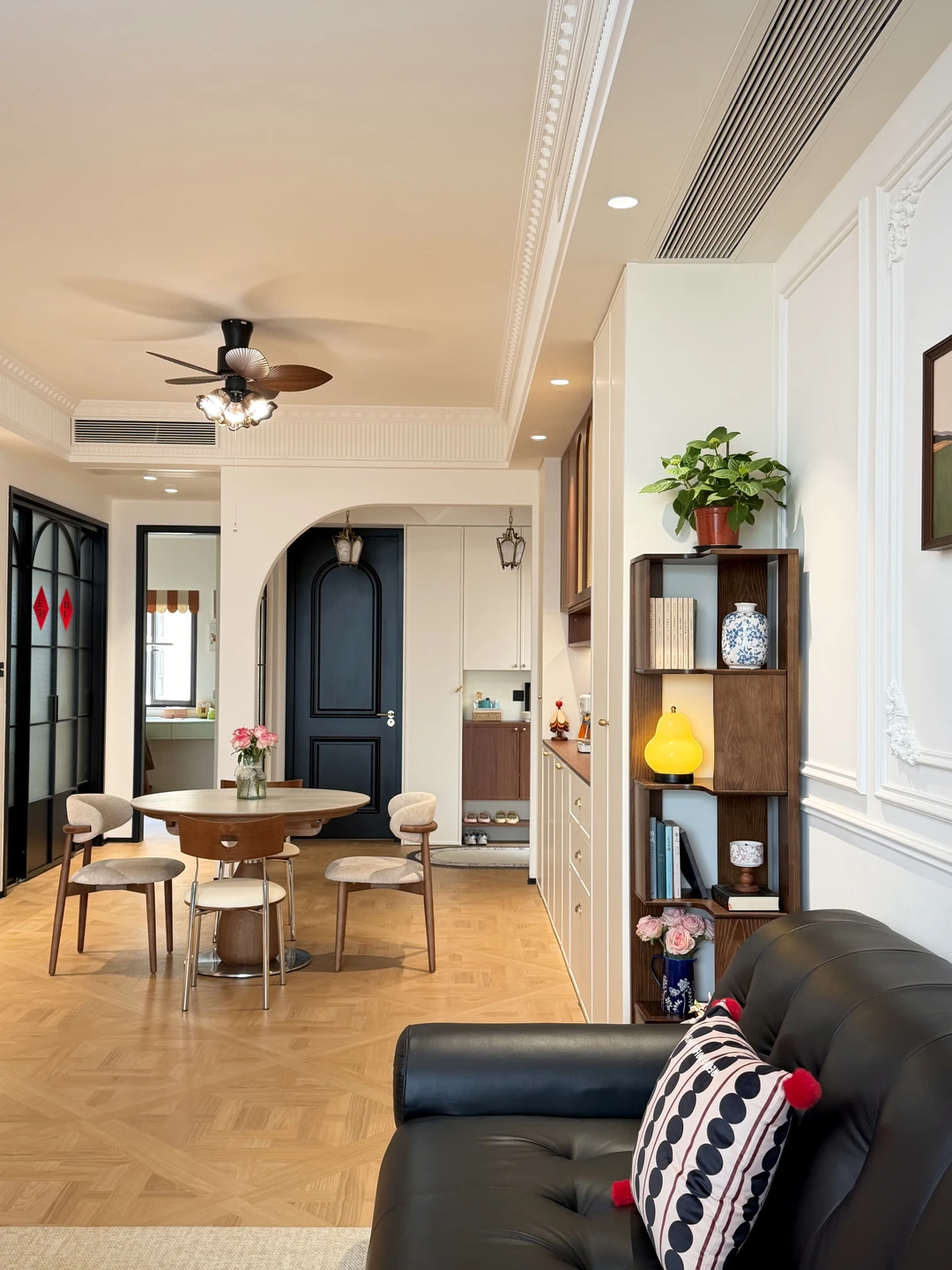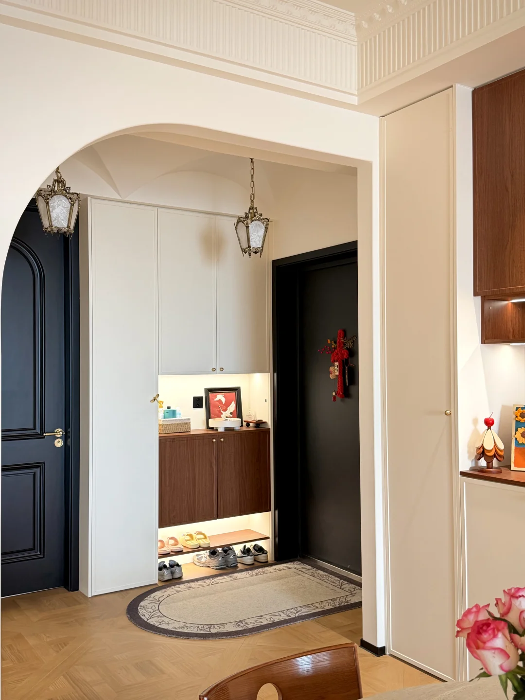 全屋通刷菱花白乳胶漆,干净、温润,像一个安静的底稿。背景墙用石膏线勾勒几道线条,不费力,就有了法式的骨架。再添一两个拱形门洞,空间的温柔便悄悄漫开来。