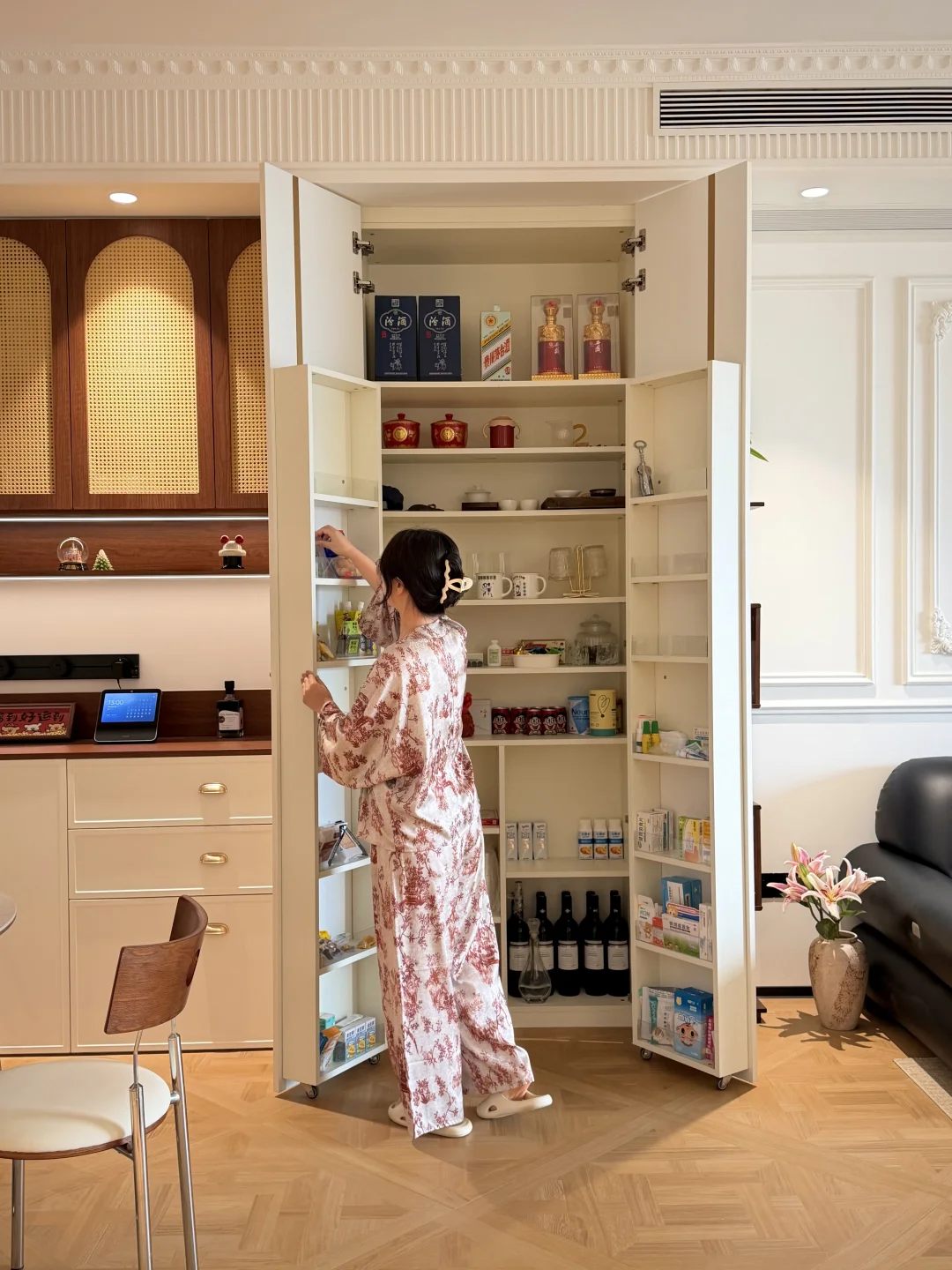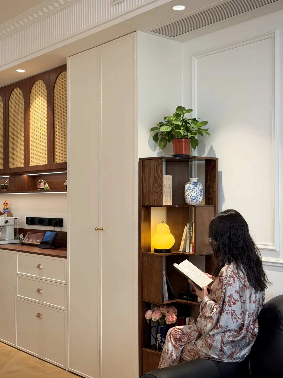 没有做无主灯,而是选了黄铜吊灯和射灯辅助,搭配落地灯等点光源,光线是柔和的,到了傍晚,只开一盏小灯,光影落在木纹上,日子也慢下来。收纳柜大多做成封闭式,只留一小部分摆放日常使用的杯碟或书,既整洁,又有生活的痕迹。