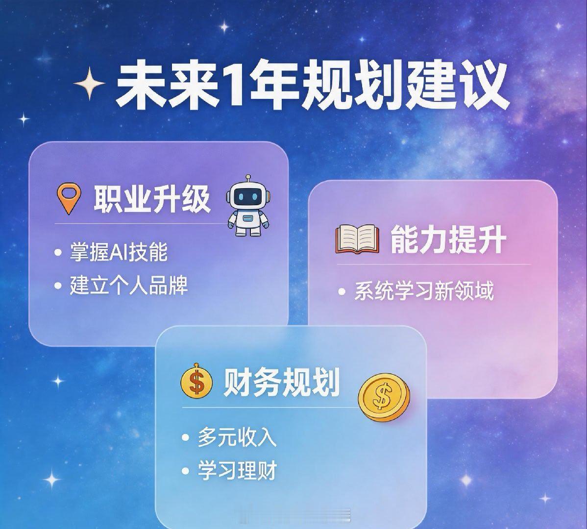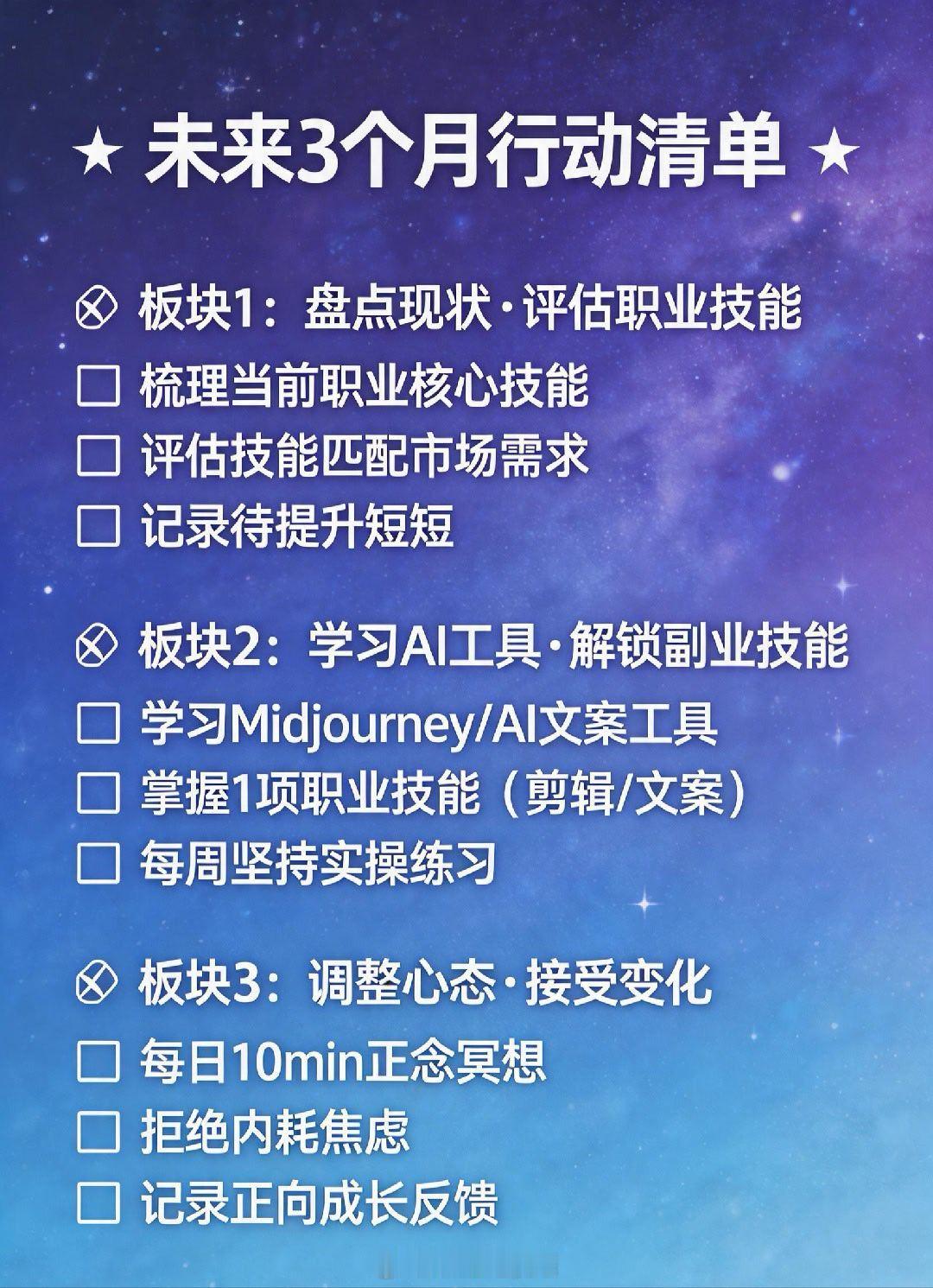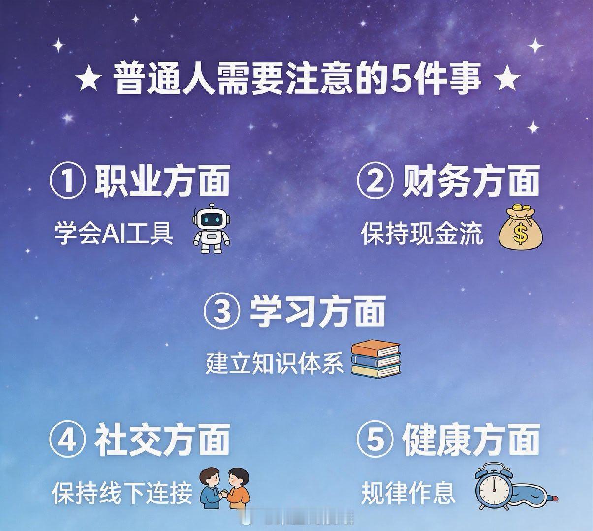 - 职业方面:不固守单一技能,学会使用AI- 财务方面:不冲动投资,保持现金流- 学习方面:建立知识体系,深度学习- 社交方面:保持线下真实连接- 健康方面:规律作息,关注心理健康
