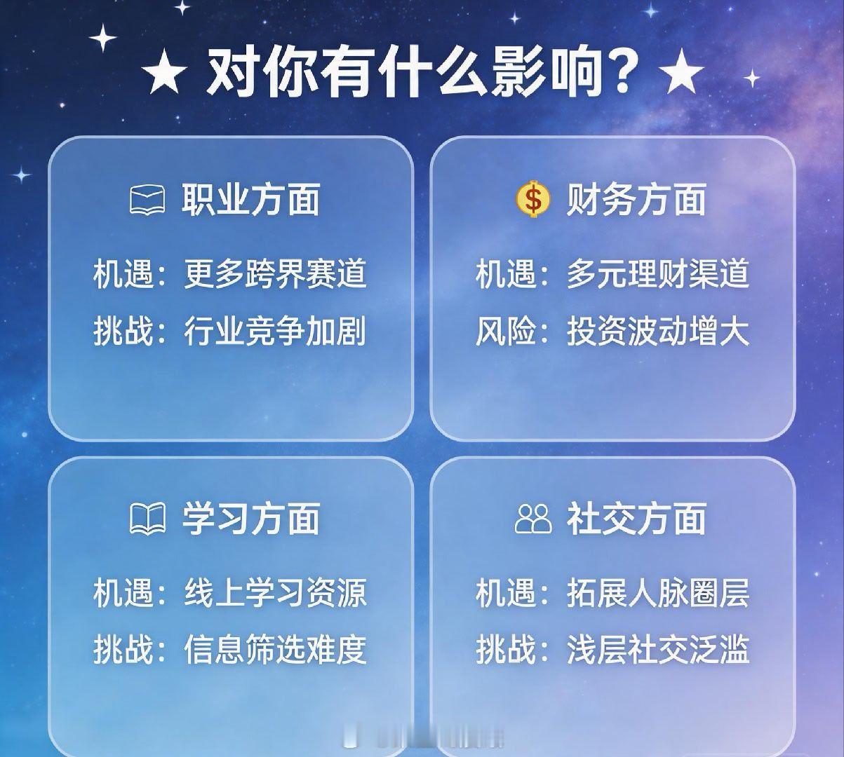 - 职业:新机遇与新挑战并存- 财务:市场波动加剧,投资需谨慎- 学习:知识获取便利但碎片化- 社交:连接更容易但深度减少- 健康:神经系统压力增大