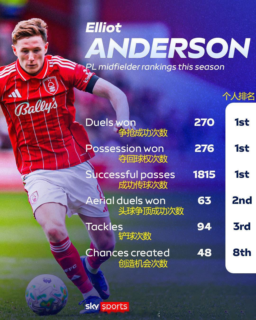 【安德森转会价为何超过1亿?】多家英媒都在放风,诺丁汉森林给英格兰国脚中场安德森,定下的放行价超过1亿英镑,森林并不会主动出售这名后腰,就算他们惨遭降级。天空体育整理了相关数据,安德森本赛季各项技术统计,在所有英超中场球员当中的排名。