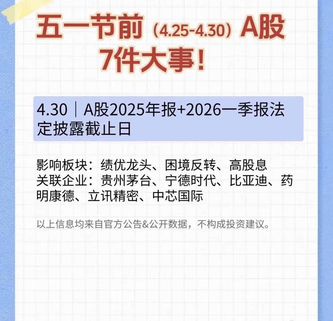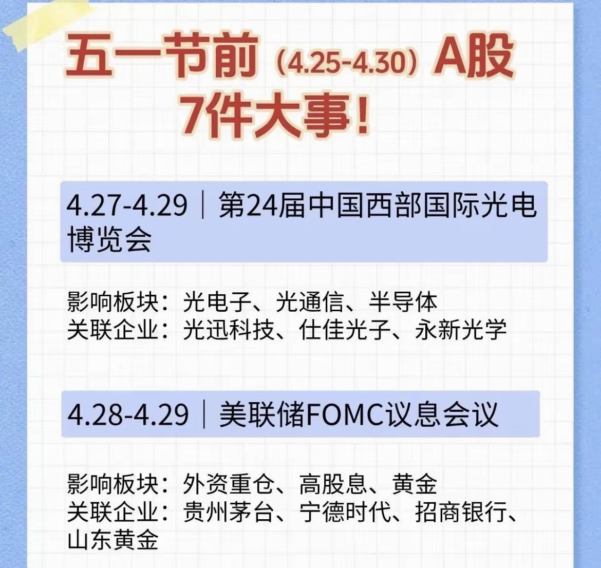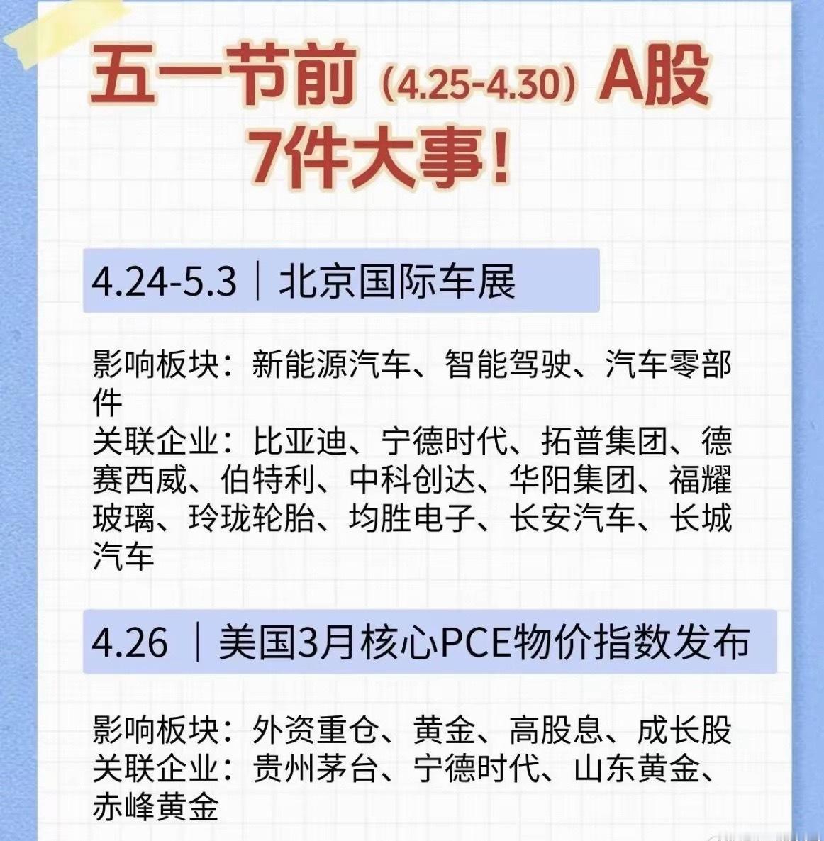 五一前A股大变局,7大关键事件落地,行情机会提前理清! 眼瞅着五一假期越来越近,A股市场也迎来了节前最后的交易窗口。短短4月25日到4月30日这几天,全球+国内重磅事件扎堆来袭,每一件都在悄悄影响不同板块的涨跌节奏。 不少散户朋友一到节前就纠结:到底该持币过节还是持股待涨?哪些方向会迎来利好催化?今天咱们就用大白话,把这7件大事掰开揉碎讲清楚,不搞晦涩术语,普通人也能一眼看懂机会和风险。1. 北京国际车展开幕,汽车产业链迎来风口时间:4月24日-5月3日作为全球顶级的汽车行业盛会,北京车展每年都会带来行业最新的技术、新品和发展方向。这次车展的重头戏,集中在新能源汽车迭代、高阶智能驾驶落地、汽车轻量化零部件升级三大方向。对A股来说,整个汽车赛道都会被持续带动:整车厂商会发布新款车型、电池厂商秀出新的技术方案、零部件企业展示配套黑科技。对于普通投资者来说,短期可以重点关注展会带来的情绪提振,长期来看,汽车智能化、电动化依旧是贯穿全年的主线,行业龙头和细分隐形冠军,都会迎来持续的资金关注度。2. 美国核心PCE数据出炉,全球流动性迎来关键信号时间:4月26日很多人看不懂PCE是什么,其实它就是美联储最看重的通胀核心指标,直接决定美联储后续要不要降息、什么时候降息。如果通胀数据回落幅度超预期,市场降息预期升温,外资就会加速流入A股,重仓白马、黄金、高股息资产都会迎来走强动力;反之如果数据居高不下,美元维持强势,外资大概率会短期观望。这个数据的波动,直接影响北向资金的买卖节奏,消费龙头、黄金赛道、优质成长股,都会随之出现明显波动,节前一定要重点留意晚间数据结果。3. 西部国际光电博览会开启,光科技板块迎来催化时间:4月27日-4月29日光电子、光通信、半导体,是科技行业的硬核根基,这次西部光电博览会,会集中展示国内光学、激光、半导体产业链的最新国产突破成果。现在全球AI算力需求持续爆发,底层的光模块、光学元器件、高速通信芯片,需求一直居高不下。展会带来的行业新品、技术突破,会直接刺激整个光电科技赛道的市场情绪,相关细分龙头,很容易走出短期的结构性行情,喜欢科技成长方向的朋友,别错过这次事件机会。4. 美联储议息会议落地,全球市场定调时间:4月28日-4月29日美联储FOMC会议,是全球资本市场的“指南针”。这次会议不仅会公布最新利率决议,美联储主席的讲话,更是会直接透露接下来的货币政策态度。如果释放偏宽松的鸽派信号,黄金会直接走强,外资偏爱消费、银行等高股息权重标的也会迎来估值修复;如果表态偏强硬,全球风险资产大概率会短期承压。节前这个时间节点,会议结果会直接影响五一假期外围市场的走势,也决定节后A股的开盘情绪。5. 数字中国建设峰会,数字经济主线再升温时间:4月29日-4月30日数字中国建设,是我们国家长期发展的核心战略之一,第九届峰会的召开,会发布算力、数据要素、信创、人工智能等领域的最新规划和落地成果。当下AI、大数据、数字基建正在全面渗透各行各业,算力底座、数据安全、国产软件这些细分赛道,本身就有很强的长期成长逻辑。峰会期间往往会有相关政策利好、合作项目落地,会直接带动数字经济产业链迎来一波集中的利好兑现,成为节前市场新的热点方向。6. 广交会三期开展,外贸板块迎来业绩预期提振时间:4月29日-5月3日广交会作为“外贸晴雨表”,是国内企业对接全球海外订单的核心平台。三期展会聚焦家电、轻工制造等出口品类,直接关系国内外贸企业的订单和全年业绩。如果展会成交数据亮眼,跨境电商、家电出口、外贸制造、航运物流这些板块,业绩预期就会大幅改善。近几年国内家电、制造企业出海提速,海外市场份额持续提升,广交会的热度,也会给相关出口龙头带来持续的利好支撑。7. 年报一季报披露收官,市场迎来业绩大考时间:4月30日4月30日是所有上市公司2025年年报、2026年一季报的法定披露最后截止日期。截止日期之前,所有公司的真实业绩都会完整亮相。绩优龙头如果业绩超预期,很容易迎来估值上涨;业绩爆雷、亏损严重的企业,则会面临资金出逃。同时,高股息、困境反转的标的,也会借着业绩披露,重新获得市场资金的重新定价,这个时间点,一定要尽量避开业绩大幅变脸的个股,聚焦真正有业绩支撑的优质公司。 最后还是要郑重提醒:以上内容仅为市场信息客观梳理分享,不构成任何具体的投资买卖建议,股市永远有风险,入市一定要谨慎。