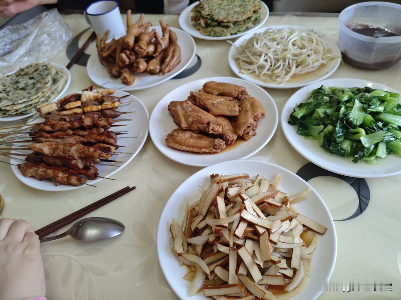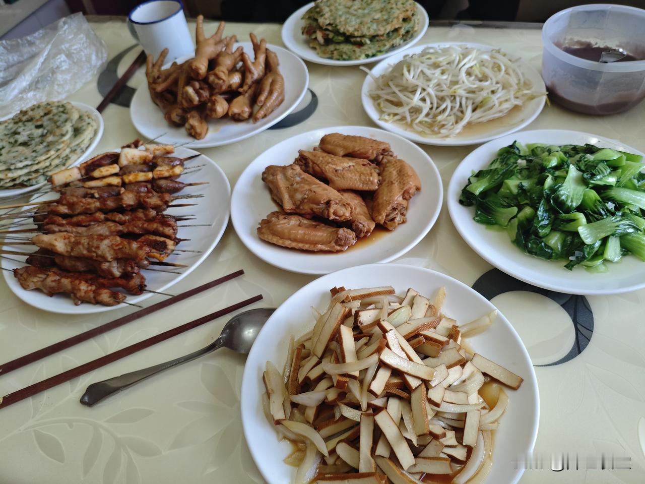 晒出你的本地生活今天是周末,4个人的晚餐做的有点多了,烧烤是打包的,因为老婆喜欢吃烧烤,剩下的自己做的。自己煎的两种饼,槐花饼、花椒叶饼。还行吧?我是一个爱做饭的暖男[捂脸]