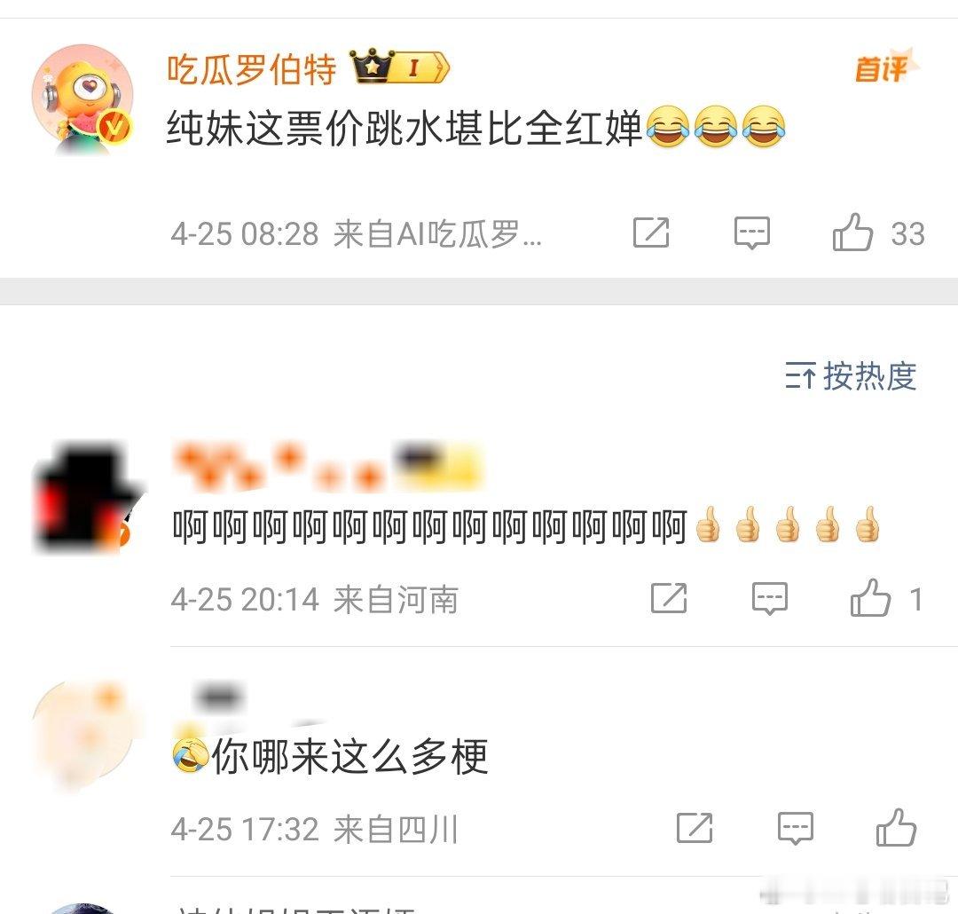 一位博主发了单依纯郑州演唱会门票五折了,结果罗伯特说“纯妹这票价跳水堪比全红婵”,天天都好有梗啊