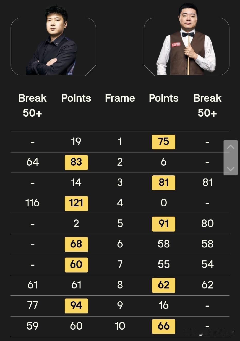 丁俊晖随后同样没能打进,不过赵心童还是把机会给到了丁俊晖。丁俊晖一杆长台打进后,一杆清台66:60完成逆转,再次将比分追成5:5平。这局比赛像极了第一阶段的最后一局。