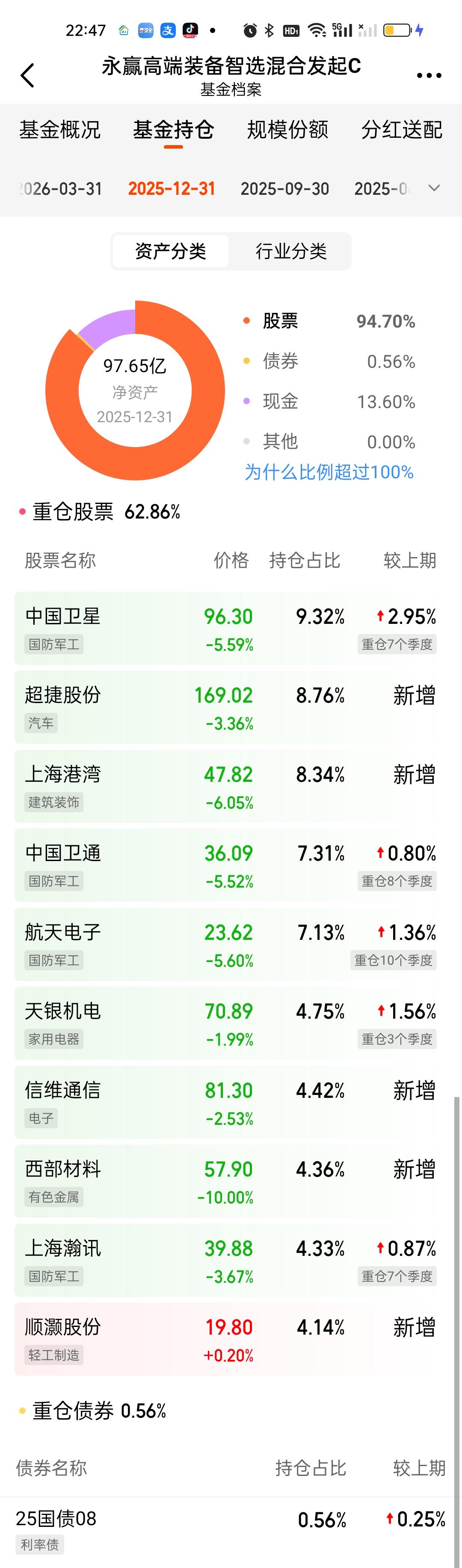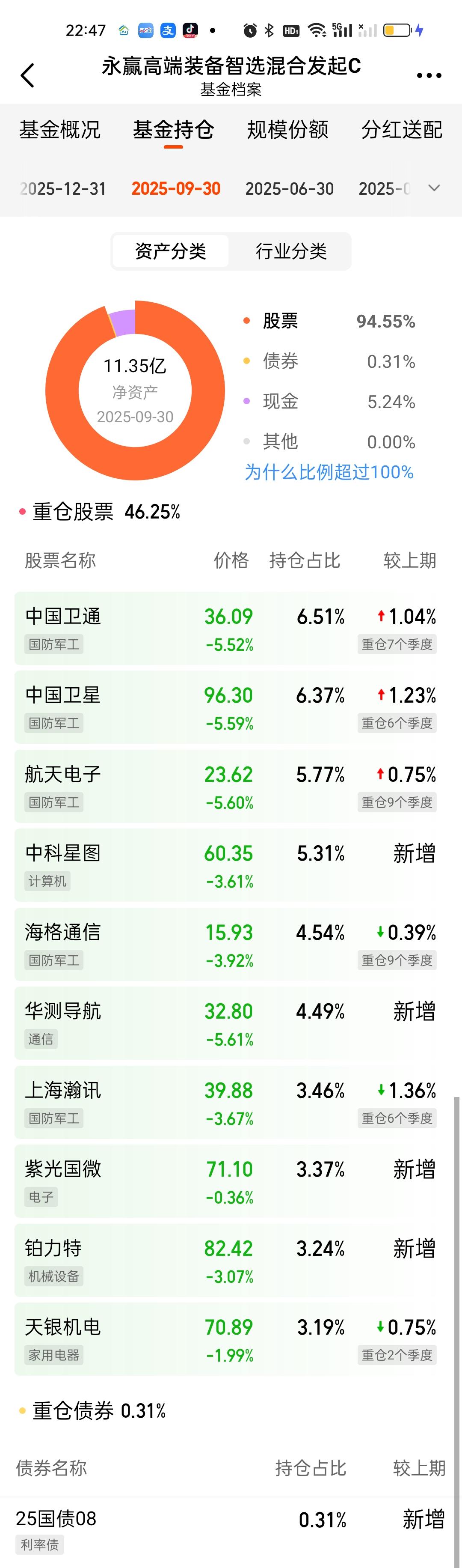 同时大幅调低了超捷股份,中国卫星,中国卫通的仓位。而且前十大重仓股占比也从62.86%下降到了46.56%。一下调低了16.30%。可能因为规模增长过快,操作上明显更加保守了。