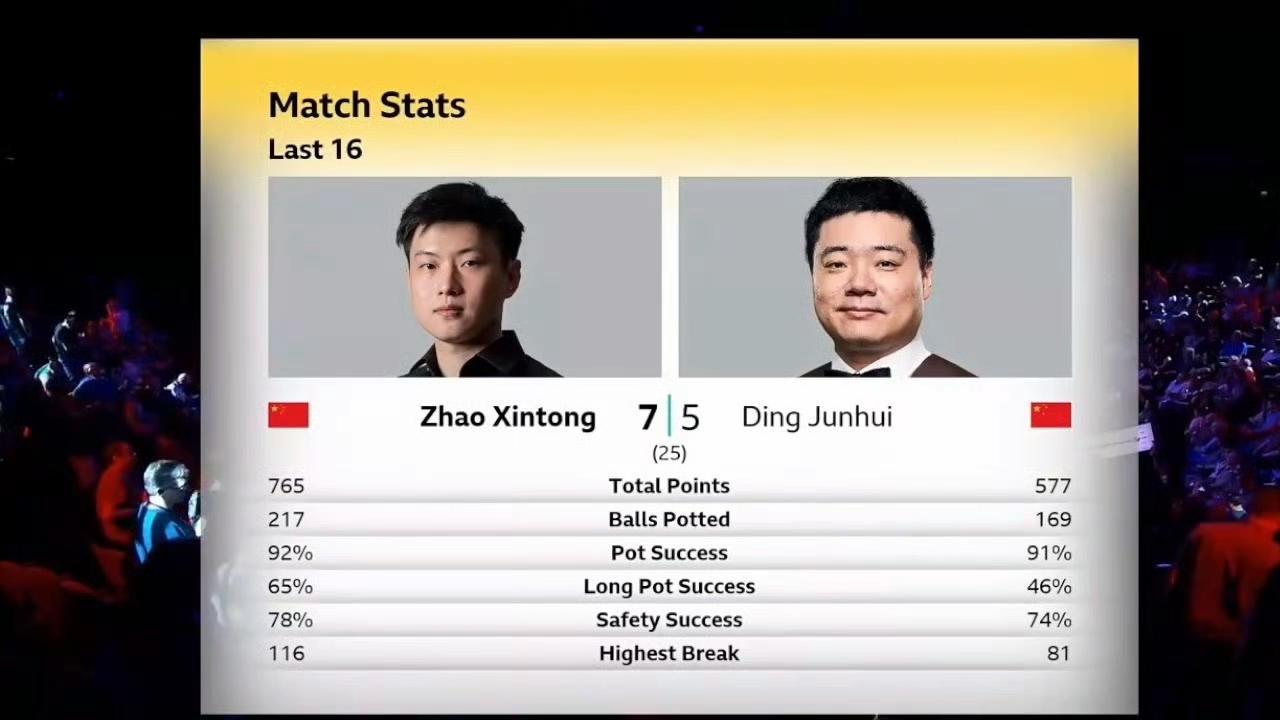 直到第12局,丁主任稳赢的局,结果被赵心童做出斯诺克,解球过程,丁主任不慎露出机会。赵心童上手清台,以7-5领先进入中场休息。