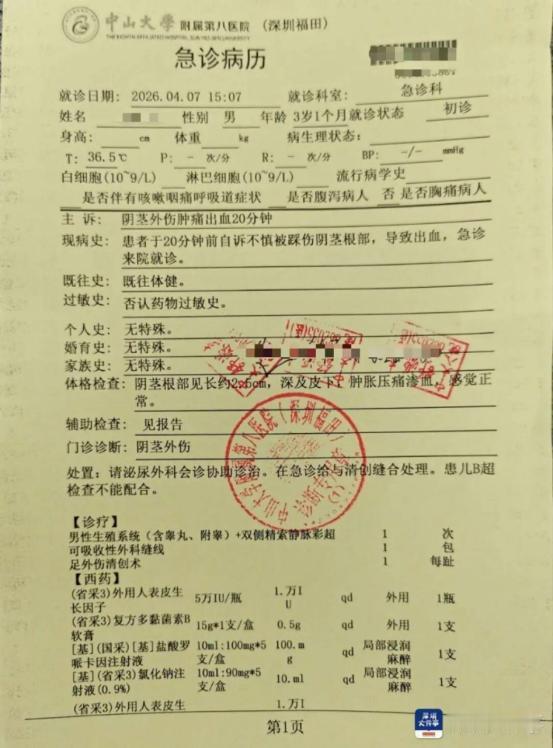 他赶紧抱起孩子往医院跑,医生检查后发现伤口足有2.5厘米长,需要缝针。一个三岁的孩子要在那样的地方被缝针,当爸爸的光是想想,心都要碎了。