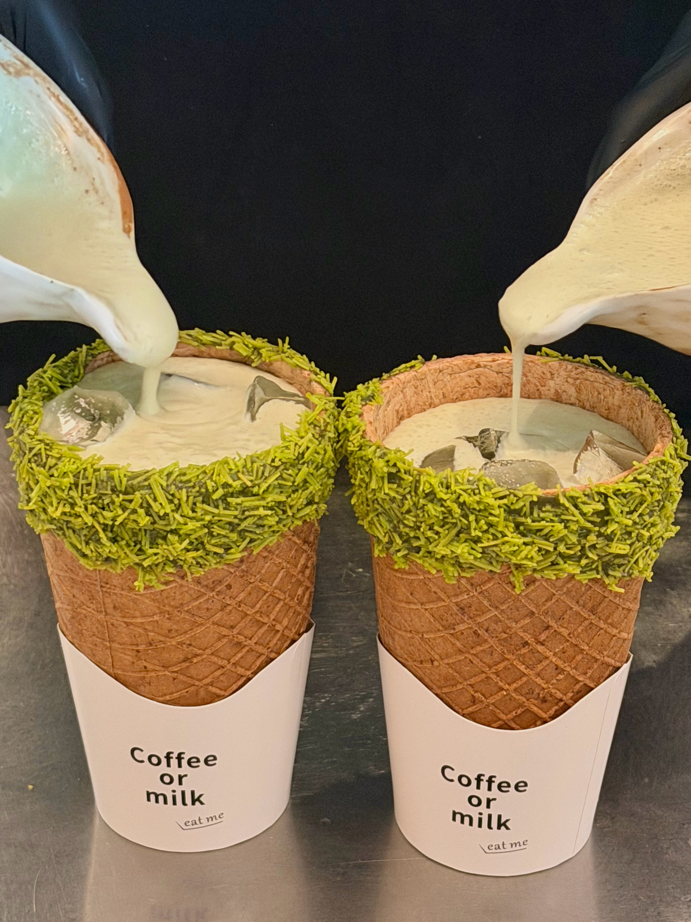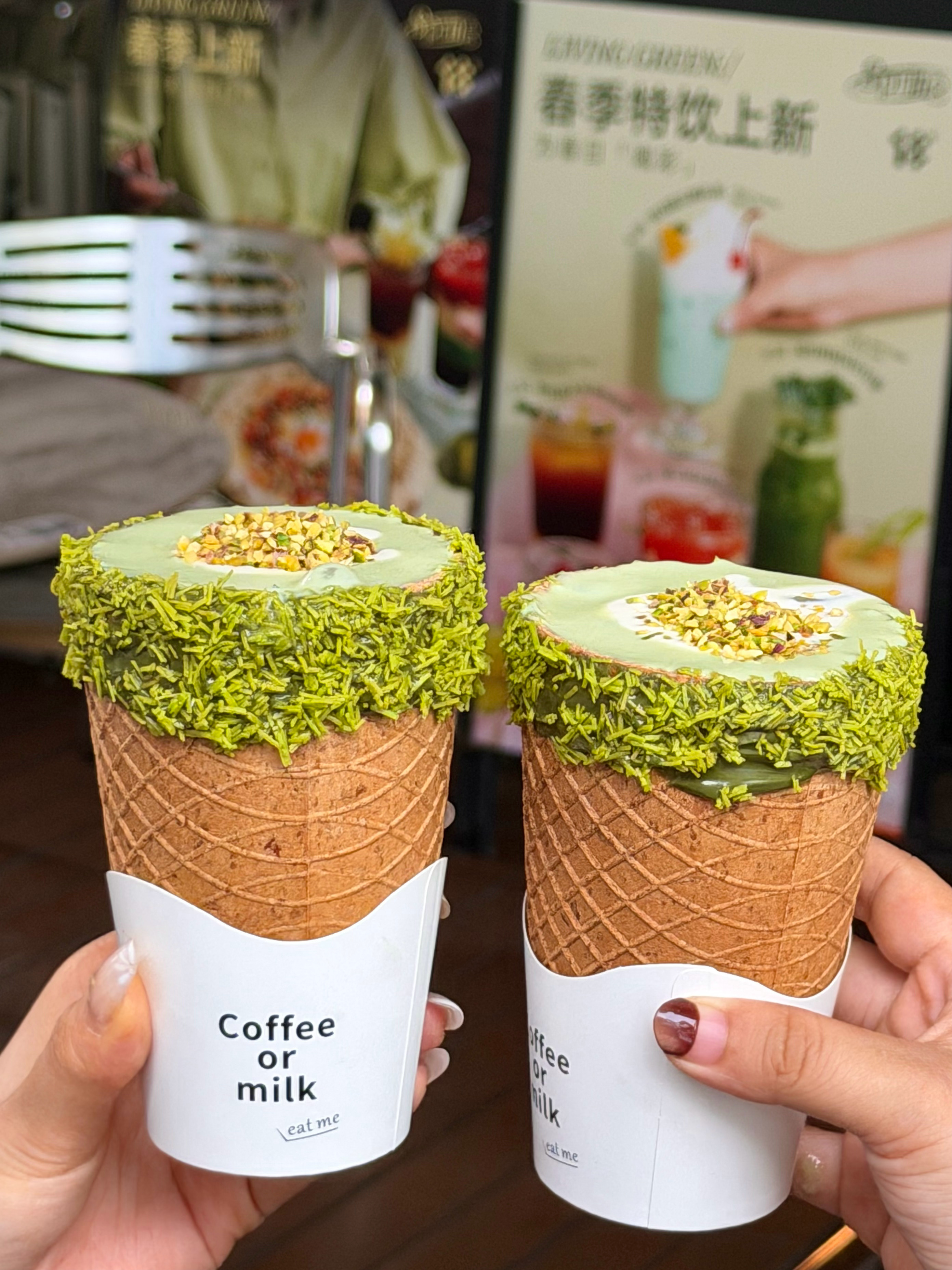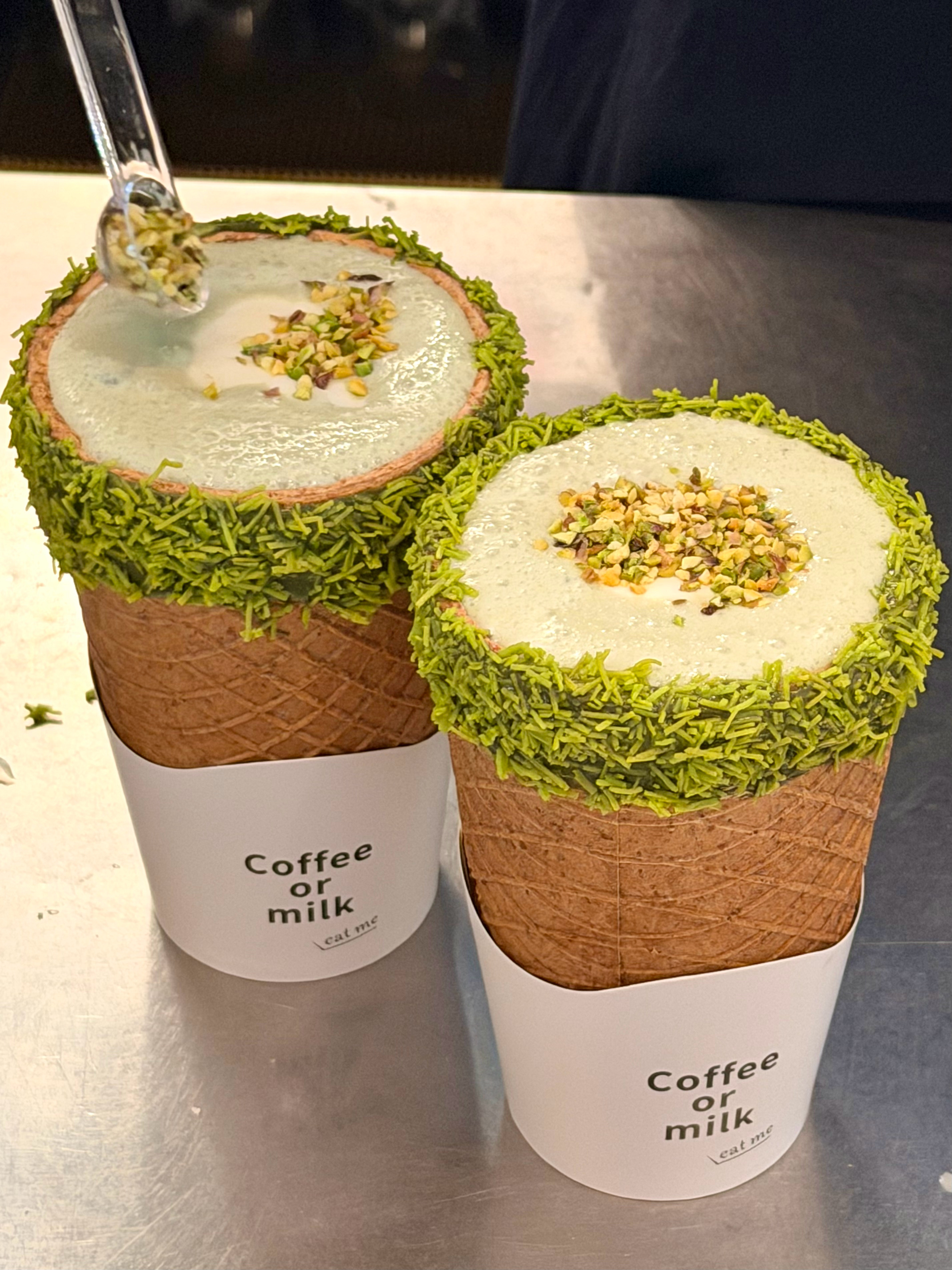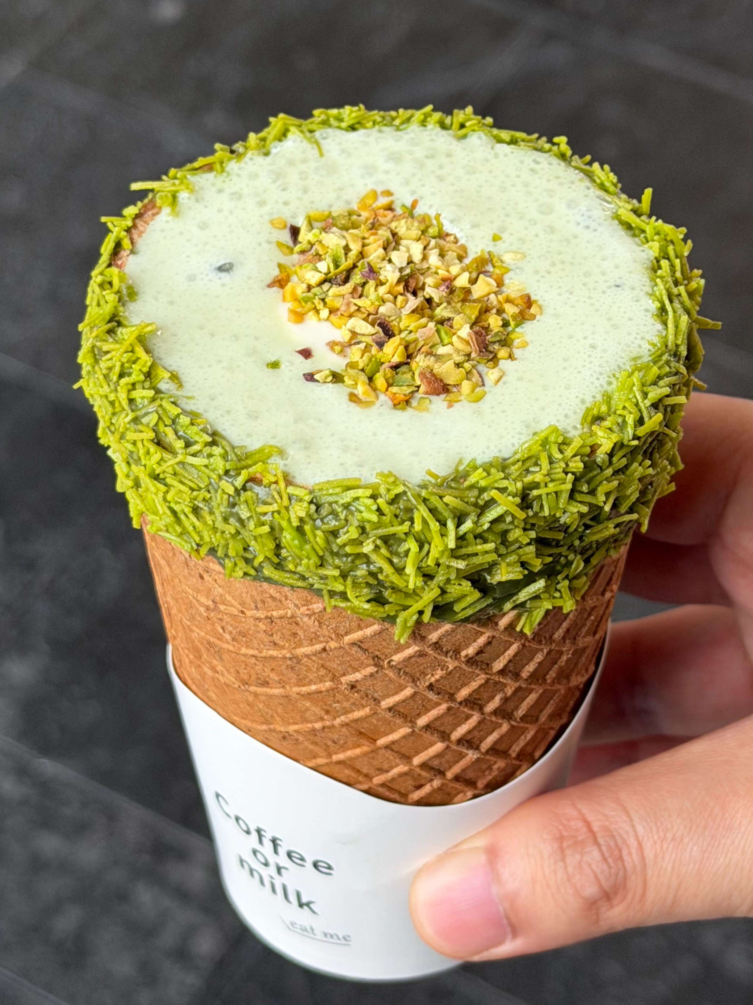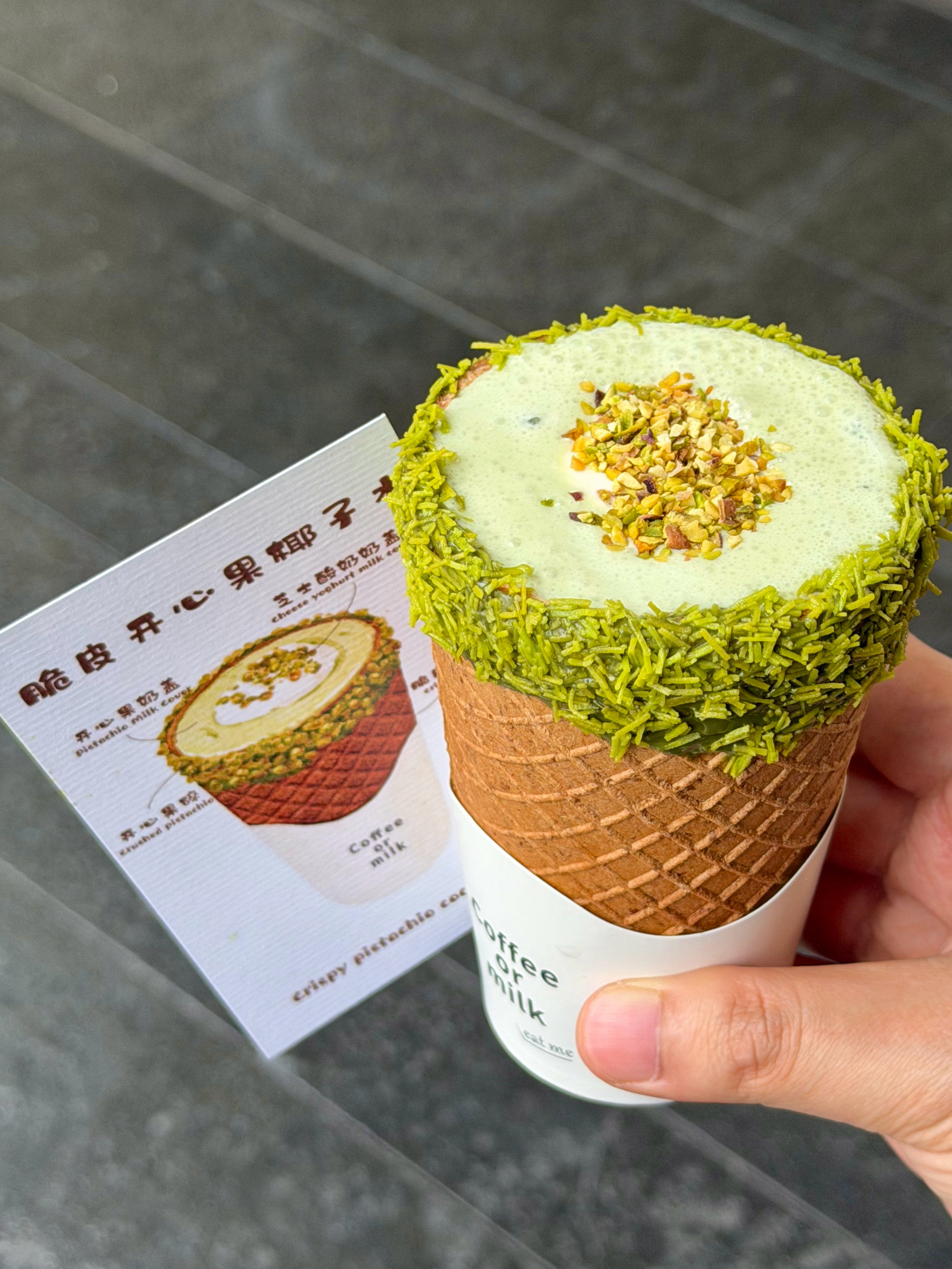 脆皮开心果椰子水🥥清甜椰子水搭配香浓开心果奶盖,还撒上了开心果碎,华夫饼做的杯子,可以一边喝一边啃,嘎嘣脆!!