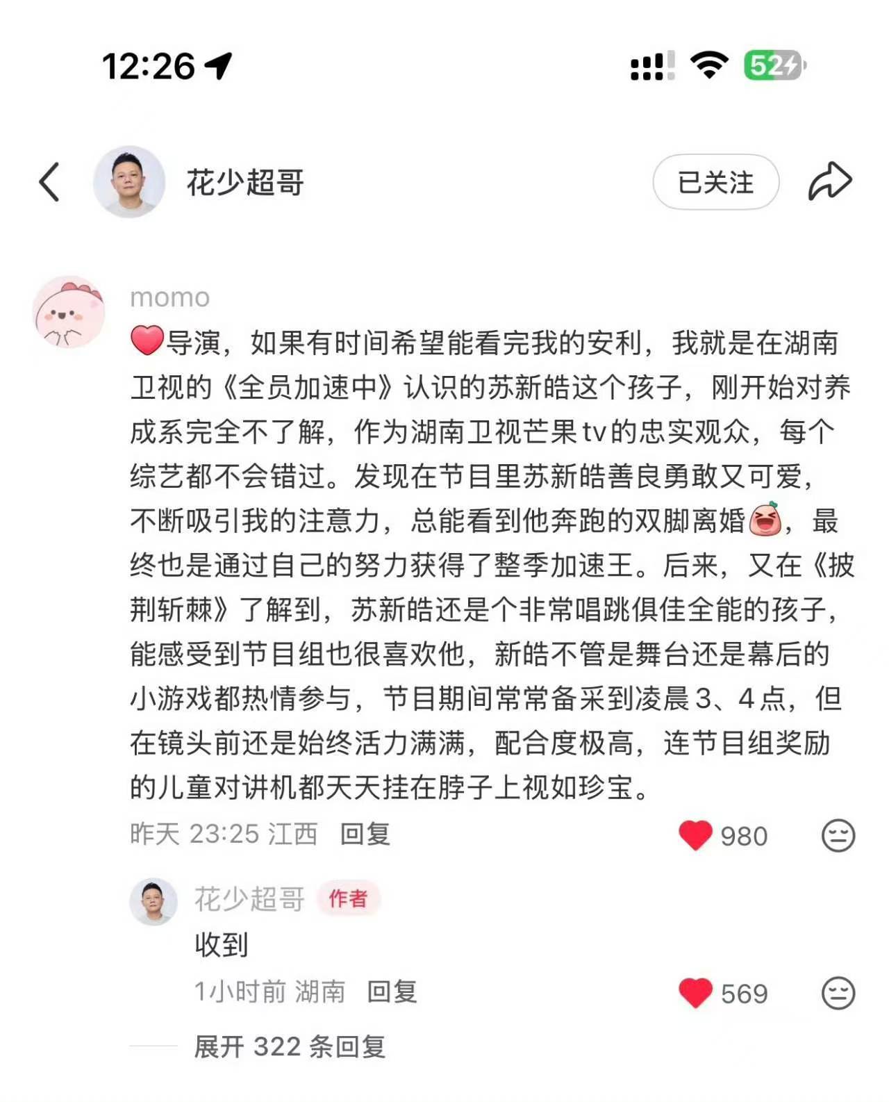 苏新皓 花少哇花少导演在两万多条评论里看见了苏新皓粉丝评论安利 并且回复收到 难