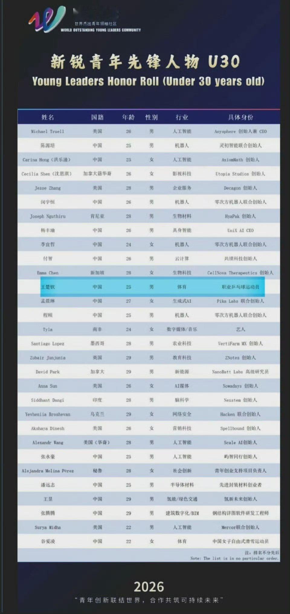 王楚钦入选新锐青年先锋人物以球拍立实力,以责任立人设,从世界冠军到全球青年榜样,
