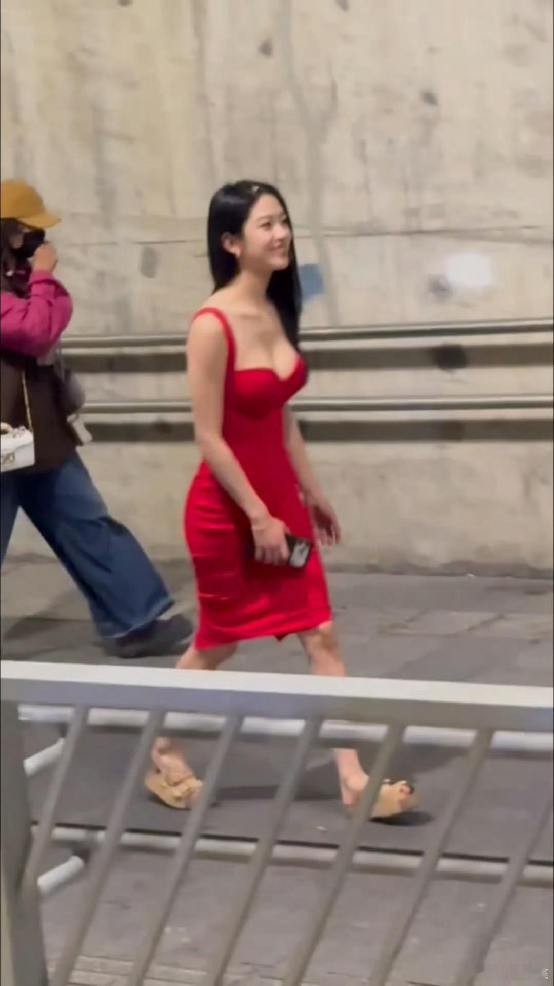 向涵之身着红色抹胸长裙,肌肤胜雪、身姿曼妙,红裙完美衬托出她纤薄的肩颈线和紧致腰身(58cm腰围),将少女灵动与成熟韵味融合。向涵之红裙美跪了