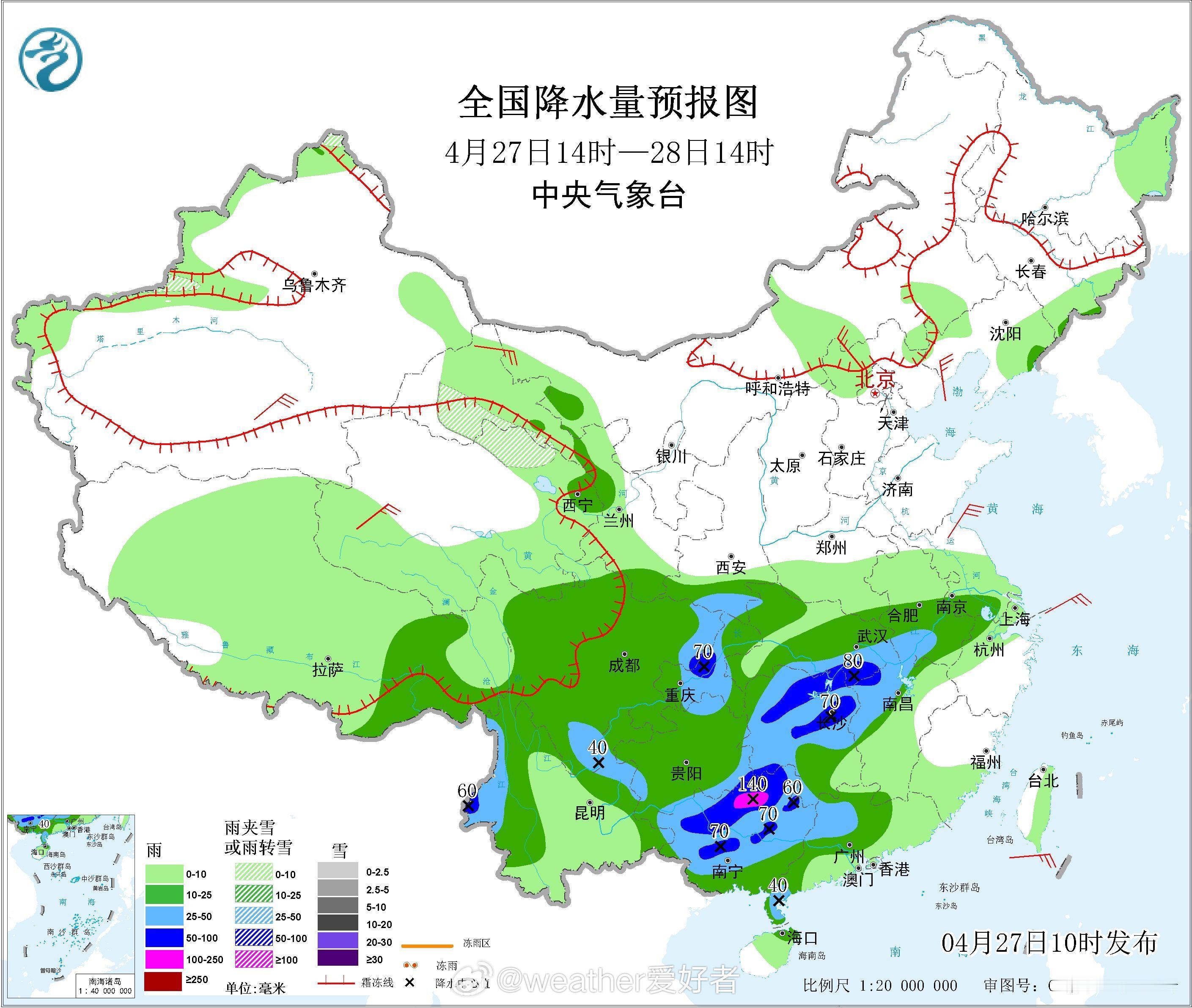 【暴雨和强对流双预警】今天上午,中央气象台继续发布暴雨蓝色预警:预计,4月27日14时至28日14时,陕西南部、四川东部和南部、重庆中部、云南西部和东北部、贵州北部和东南部、湖北南部、江南西北部、华南西部和南部等地部分地区有大到暴雨。