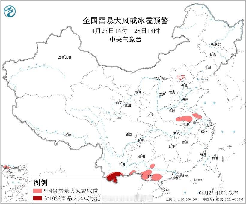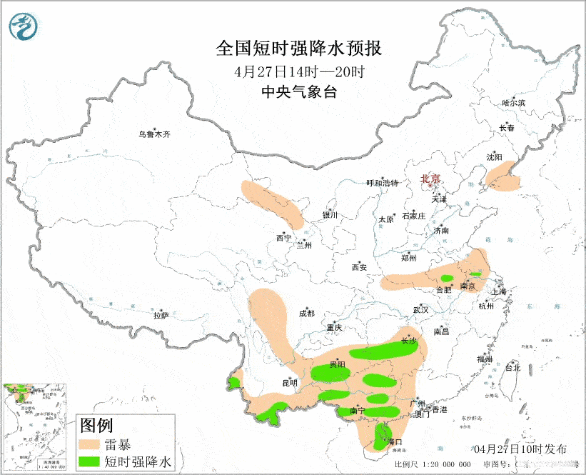 继续发布强对流天气蓝色预警:预计4月27日14时至28日14时,黄淮南部、江淮北部、华南西部、西南地区南部等地的部分地区将有8级以上雷暴大风或冰雹天气,其中,云南南部等地的部分地区将有10级以上雷暴大风。