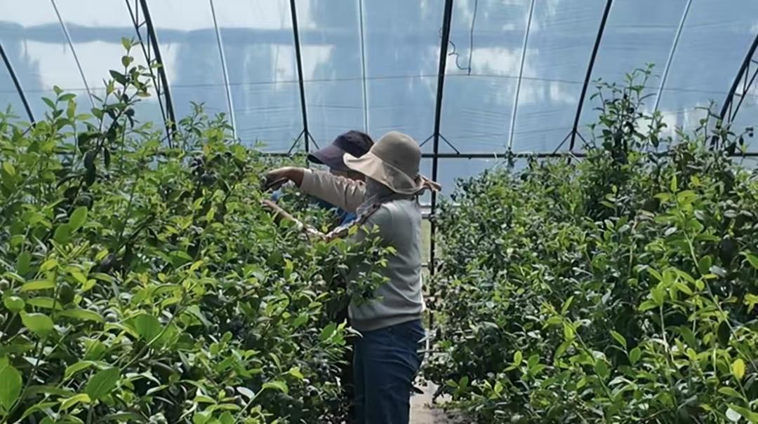 在历城区唐王街道的一处盆栽蓝莓基地,工作人员正在大棚里进行采摘。基地负责人滕丕亮表示,今年全国蓝莓产能爆发,亩产收益有所下滑,每亩收益约七八万元,成本约两万五,“不如之前赚得多”。
